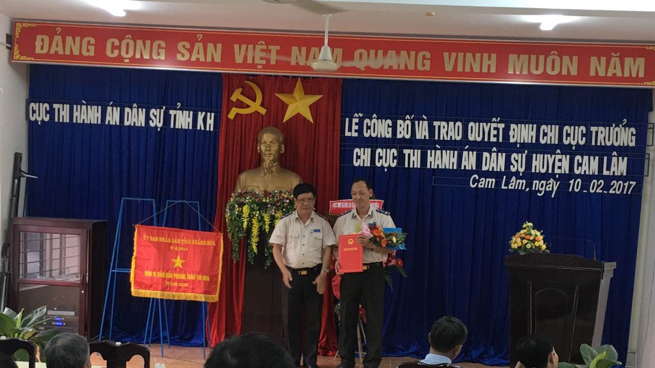 Cũng tại buổi lễ trao Quyết định bổ nhiệm Chi cục trưởng Chi cục Thi hành án dân sự huyện Cam Lâm, thừa ủy quyền của Chủ tịch UBND tỉnh Khánh Hòa, đồng chí Phó Cục trưởng Nguyễn Hữu Anh đã trao tặng Cờ "Đơn vị dẫn đầu phong trào thi đua năm 2016" của UBND tỉnh cho Chi cục Thi hành án dân sự huyện Cam Lâm.
