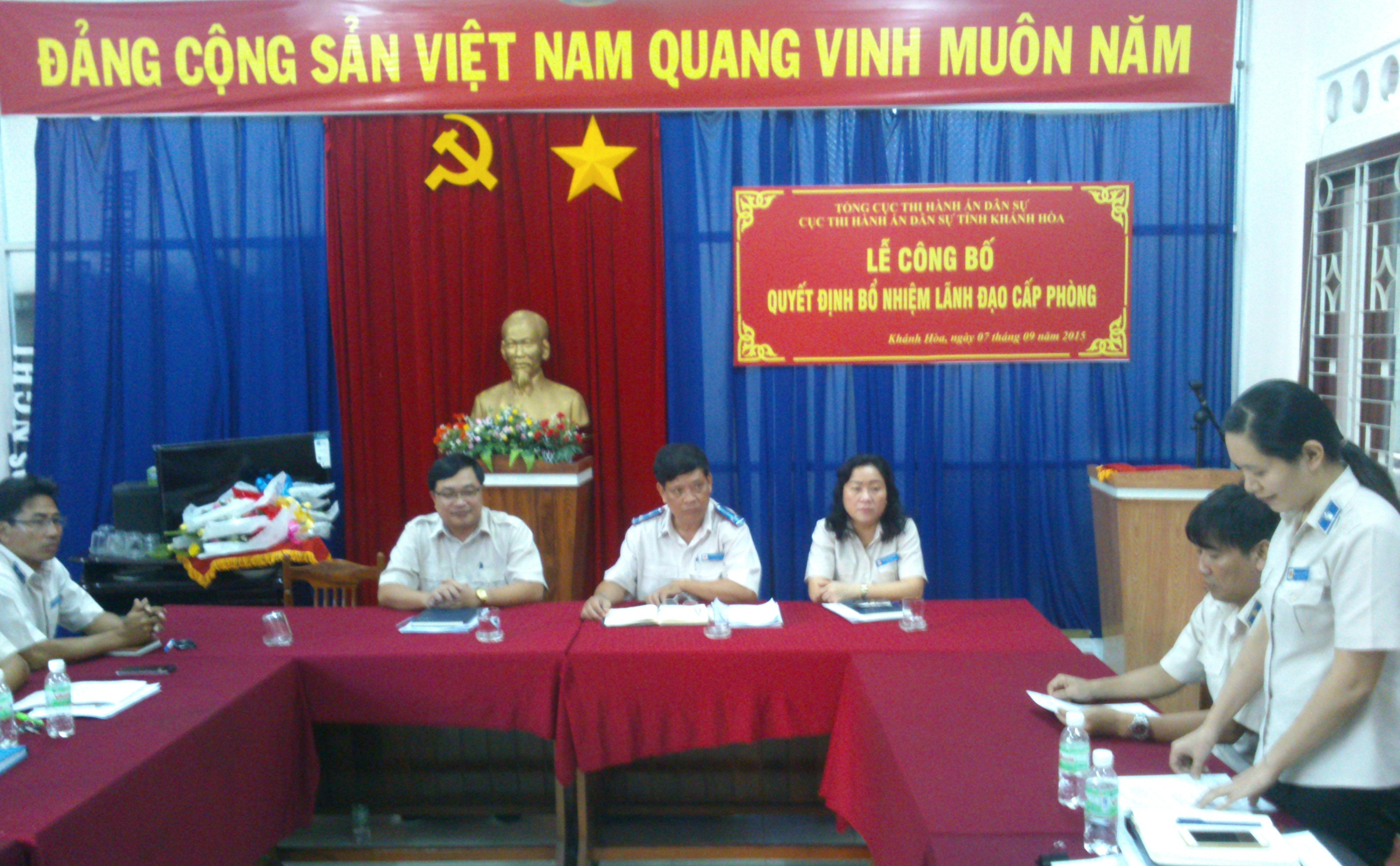 Theo các Quyết định của Cục trưởng, đồng chí Ngô Thế Lâm - Phó Trưởng phòng Phòng Kiểm tra, giải quyết khiếu nại, tố cáo được bổ nhiệm giữ chức vụ Trưởng phòng Phòng Kiểm tra, giải quyết khiếu nại, tố cáo; đồng chí Nguyễn Xuân Quang - Chấp hành viên sơ cấp Cục Thi hành án dân sự tỉnh Khánh Hòa được bổ nhiệm giữ chức vụ Phó Trưởng phòng Phòng Nghiệp vụ và tổ chức thi hành án dân sự; đồng chí Man Thắng Trí - Chấp hành viên sơ cấp Cục Thi hành án dân sự tỉnh Khánh Hòa được bổ nhiệm giữ chức vụ Phó Trưởng phòng Phòng Tổ chức cán bộ; điều động đồng chí Lê Mạnh Hùng - Trưởng phòng Phòng Tổ chức cán bộ làm Chánh Văn phòng Cục thay đồng chí Nguyễn Thị Kim Huệ được miễn nhiệm chức vụ Chánh Văn phòng vì lý do sức khỏe.