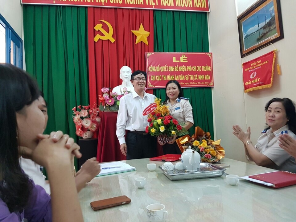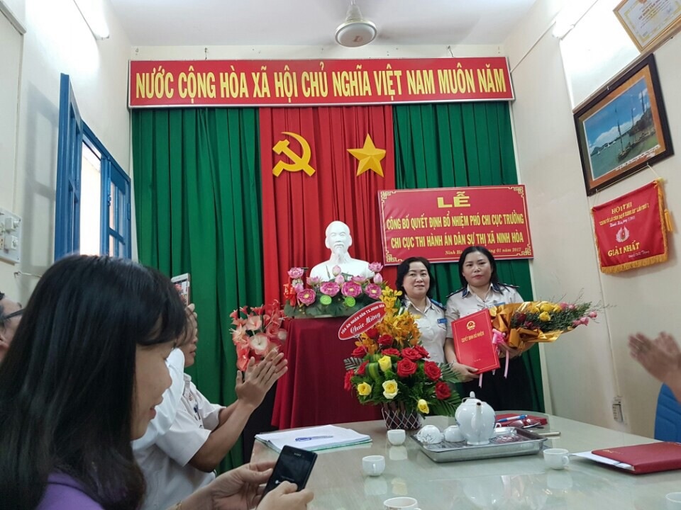 Theo Quyết định số 2591/QĐ-CTHADS ngày 19 tháng 12 năm 2016 của Cục trưởng, đồng chí Nguyễn Thị Khoa – Chấp hành viên sơ cấp Chi cục Thi hành án dân sự thị xã Ninh Hòa được bổ nhiệm giữ chức vụ Phó Chi cục trưởng Chi cục Thi hành án dân sự thị xã Ninh Hòa từ ngày 03 tháng 01 năm 2017.