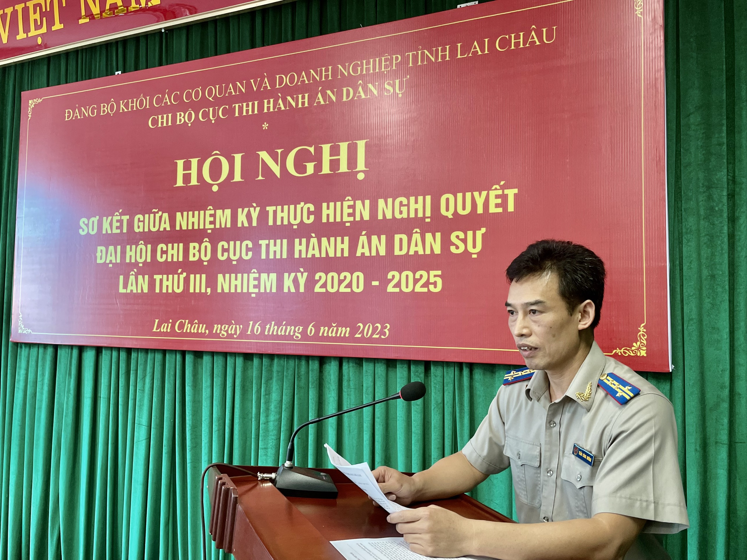 Thực hiện Kế hoạch số 87-KH/ĐUK ngày 13/4/2023 của Đảng ủy Khối các cơ quan và doanh nghiệp tỉnh Lai Châu về sơ kết giữa nhiệm kỳ thực hiện Nghị quyết Đại hội đảng bộ khối lần thứ IV, nhiệm kỳ 2020-2025. Chiều ngày 16/6/2023, Chi bộ Cục Thi hành án dân sự tổ chức Hội nghị sơ kết giữa nhiệm kỳ thực hiện Nghị quyết Đại hội Chi bộ Cục Thi hành án dân sự khóa III, nhiệm kỳ 2020-2025. Đồng chí Trần Công Hướng, Bí thư Chi bộ chủ trì Hội nghị. Dự và chỉ đạo Hội nghị có đồng chí Đồng Thị Lan, Ủy viên Ban Thường vụ, Phó trưởng Ban Tuyên giáo Đảng ủy khối các cơ quan và doanh nghiệp tỉnh Lai Châu.