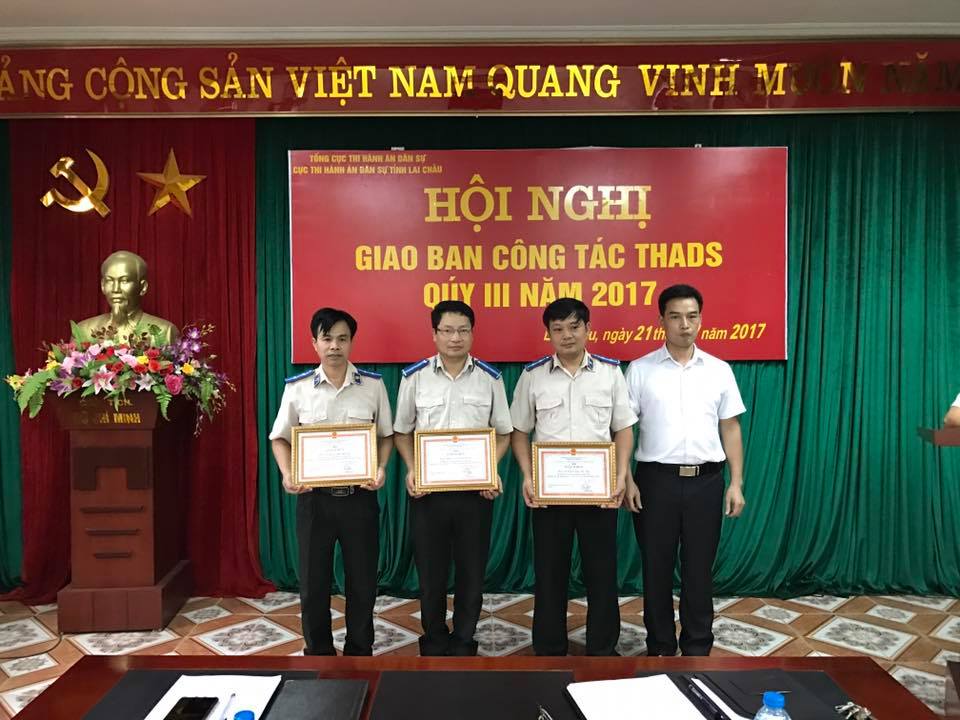 Hội nghị đã công bố và trao quyết định khen thưởng của Tổng cục trưởng Tổng cục THADS, Cục trưởng Cục THADS tỉnh Lai Châu cho các tập thể và cá nhân có thành tích cao trong đợt thi đua cao điểm lập thành tích chào mừng kỷ niệm 71 năm Ngày truyền thống thi hành án dân sự.