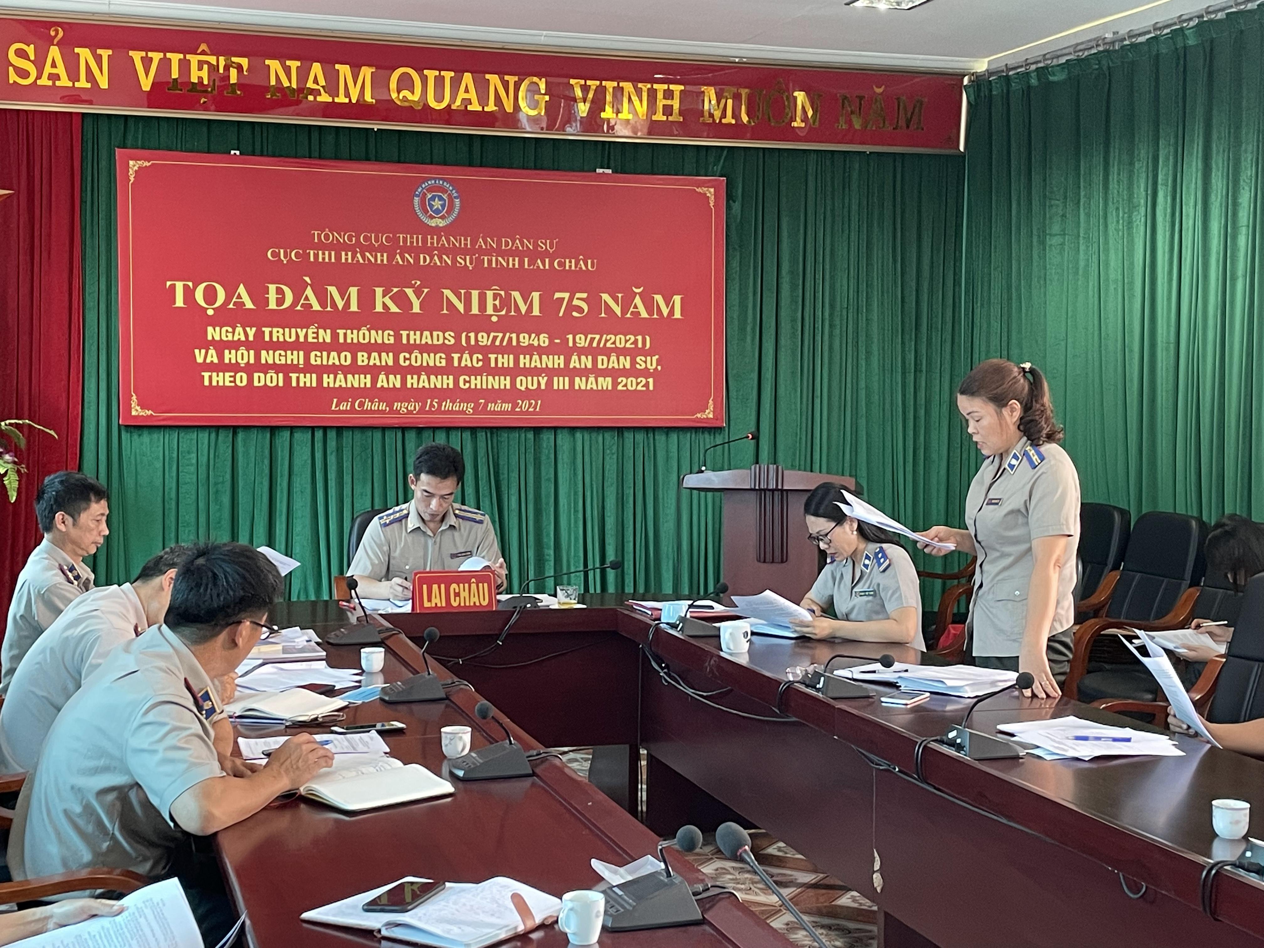Tại Hội nghị, đồng chí Phạm Thị Việt Thanh, Chánh văn phòng Cục đã trình bày báo cáo kết quả công tác thi hành án dân sự 9 tháng đầu năm 2021, phương hướng nhiệm vụ, giải pháp công tác 3 tháng cuối năm 2021. Theo báo cáo, trong 9 tháng đầu năm (tính từ 01/10/2020 đến 30/6/2021) toàn tỉnh phải giải quyết1.712 việc = 22.841.631.000 đồng; trong đó số thụ lý mới 1.580 việc (tăng 282 việc = 21,7% so với cùng kỳ năm 2020), với số tiền 14.720.529.000 đồng (tăng 4.233.752.000 đồng = 40,4% so với cùng kỳ năm 2020). Số việc thi hành xong 1.449 việc (tăng 288 việc = 18,7% so với cùng kỳ năm 2020), đạt tỷ lệ 88,5% (vượt 5% so với chỉ tiêu giao năm 2021). Số tiền thi hành xong 10.815.957.000 đồng (tăng 6.060.879.000 đồng = 127,5% so với cùng kỳ năm 2020), đạt tỷ lệ 57,7% (vượt 15,6% so với chỉ tiêu giao năm 2021).