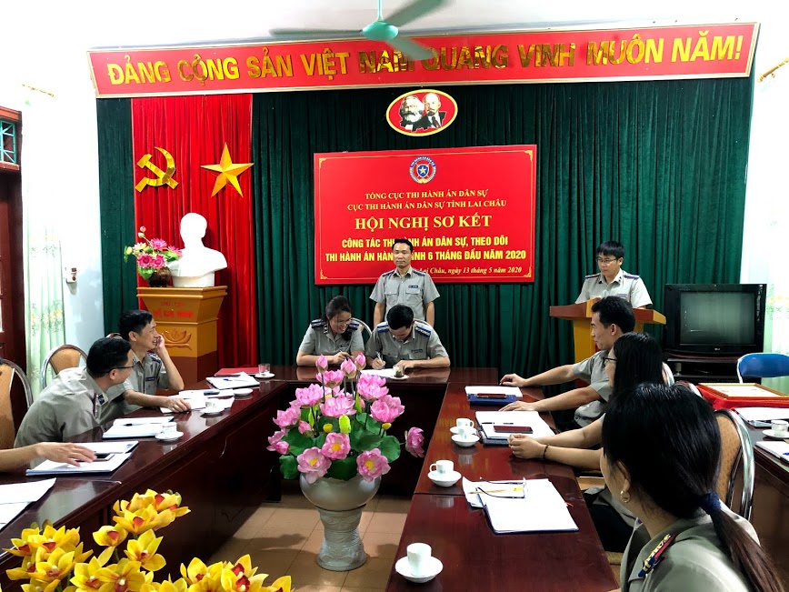 Hội nghị đã nghe báo cáo đánh giá tình hình và kết quả công tác thi hành án dân sự, theo dõi thi hành án hành chính 6 tháng đầu năm, phương hướng nhiệm vụ công tác 6 tháng cuối năm năm 2020 của Cục THADS tỉnh. Theo báo cáo, trong 6 tháng đầu năm (tính từ ngày 01/10/2019 đến ngày 31/3/2020) toàn ngành thi hành án tỉnh Lai Châu thụ lý 1.078 việc, tăng 154 việc (16,7%) so với cùng kỳ năm 2019, trong đó: số năm trước chuyển sang (trừ số đã chuyển sổ theo dõi riêng) là 130 việc, số tiền phải giải quyết là 10.807.931.000 đồng, giảm 48.376.941.000 đồng (81,2%) ( do đã trừ số chuyển số theo dõi riêng) so với cùng kỳ năm 2019. Trong đó số có điều kiện, đã giải quyết xong về việc là: 884 việc, đạt tỷ lệ 87,8%, tăng 240 việc (37,2%) so với cùng kỳ năm 2019 (Vượt 5,8% so với chỉ tiêu được giao năm 2020); về tiền đã thi hành xong 2.978.991.000 đồng, đạt tỷ lệ 41,5%, giảm 2.182.076.000 đồng (42,3%) so với cùng kỳ năm 2019 (Vượt 2% so với chỉ tiêu được giao năm 2020). Số việc chuyển kỳ sau là 187 việc = 7.095.170.000 đồng. Các nhiệm vụ khác cơ bản đảm bảo tiến độ theo kế hoạch đề ra từ đầu năm. Đã ra quyết định thi hành án cơ bản đảm bảo đúng thời hạn đối với các bản án, quyết định về dân sự của Tòa án đã có hiệu lực pháp luật. Việc xác minh, phân loại án có điều kiện, chưa có điều kiện tại hầu hết các đơn vị đảm bảo chính xác, đúng pháp luật. Đã kiên quyết áp dụng biện pháp bảo đảm, biện pháp cưỡng chế để thi hành dứt điểm một số vụ việc phức tạp, có giá trị phải thi hành lớn góp phần nâng cao tỷ lệ thi hành án về việc, về tiền của toàn tỉnh. Đăng tải đầy đủ, kịp thời danh sách người phải thi hành án dân sự chưa có điều kiện thi hành lên Trang thông tin điện tử. Kỷ cương, kỷ luật hành chính tiếp tục được tăng cường.