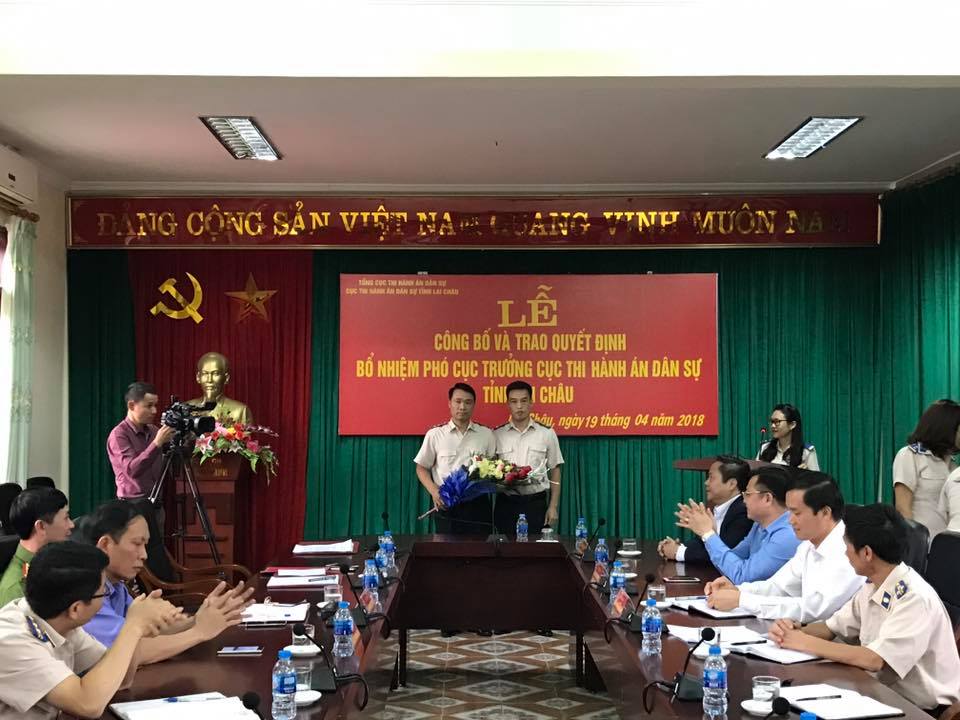Tại buổi Lễ, đồng chí Trần Công Hướng, Quyền Cục trưởng đã công bố Quyết định số 459/QĐ-BTP ngày 02/4/2018 của Tổng cục trưởng Tổng Cục Thi hành án dân sự về việc bổ nhiệm chức vụ Phó Cục trưởng Cục THADS tỉnh Lai Châu đối với đồng chí Lại Hữu Đồng, Chấp hành viên Trung cấp Cục THADS tỉnh kể từ ngày 15/04/2018. Đồng chí Tống Thanh Hải, Ủy viên Ban Thường vụ Tỉnh ủy, Phó Chủ tịch thường trực Ủy ban nhân dân tỉnh, Trưởng ban chỉ đạo THADS tỉnh đại diện cấp ủy, Chính quyền địa phương đã trao Quyết định bổ nhiệm và tặng hoa chúc mừng đồng chí Lại Hữu Đồng.