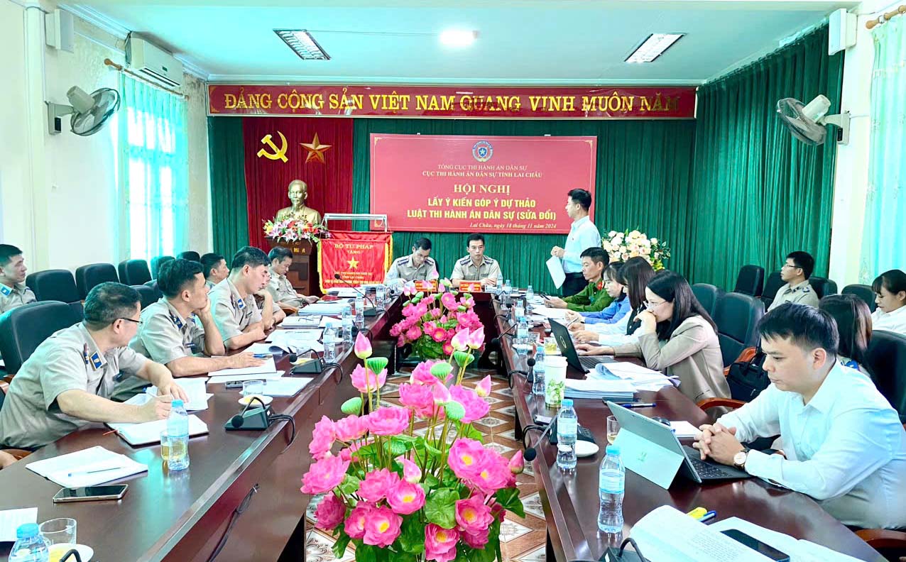 Ngày 18/11, Cục Thi hành án dân sự (THADS) tỉnh Lai Châu tổ chức Hội nghị Lấy ý kiến góp ý dự thảo Luật THADS (sửa đổi). Các đồng chí: Trần Công Hướng - Cục trưởng Cục THADS tỉnh, Nguyễn Duy Phiên – Phó Cục trưởng Cục THADS tỉnh; Phạm Văn Hiển – Phó Cục Trưởng Cục THADS tỉnh đồng chủ trì hội nghị. Dự hội nghị có đồng chí: Hoàng Quốc Khánh – Phó Trưởng Đoàn Đại biểu Quốc hội tỉnh; lãnh đạo Công an tỉnh, Tòa án Nhân dân tỉnh, Viện Kiểm sát Nhân dân tỉnh, Sở Tư Pháp; cùng đông đủ cán bộ, công chức Cục THADS tỉnh.