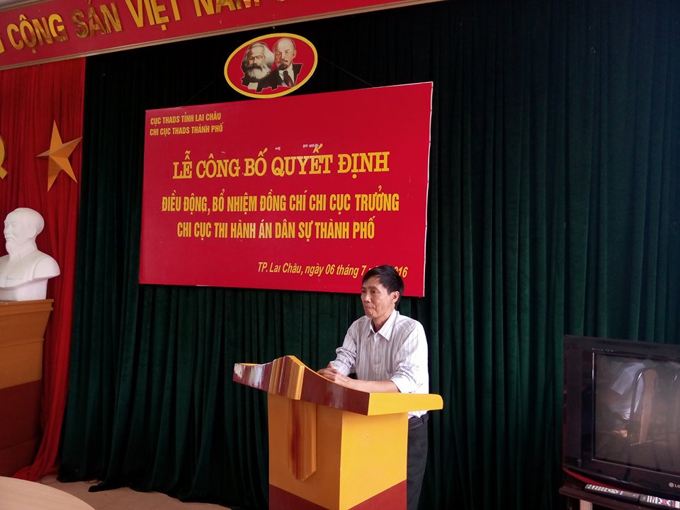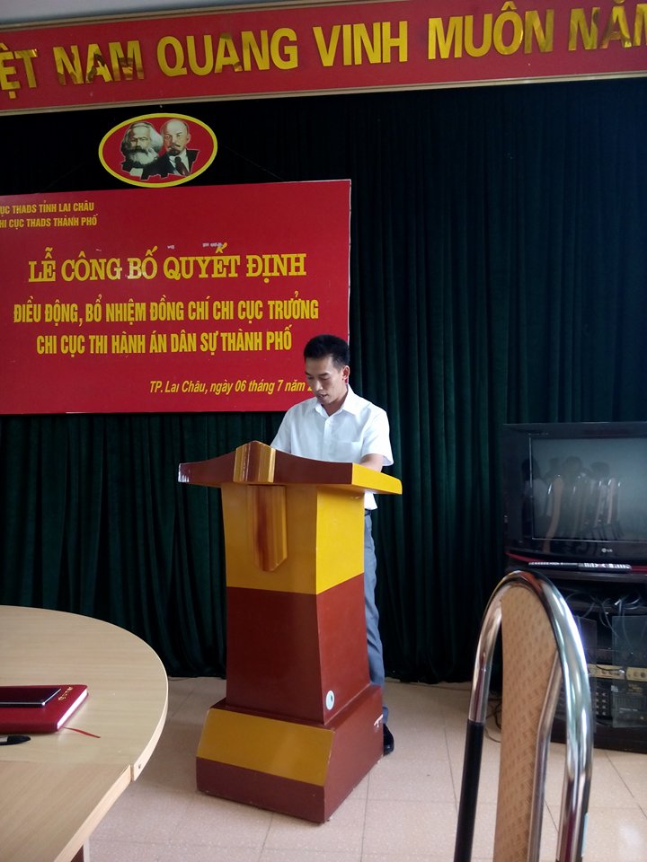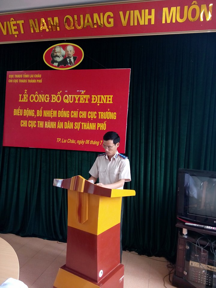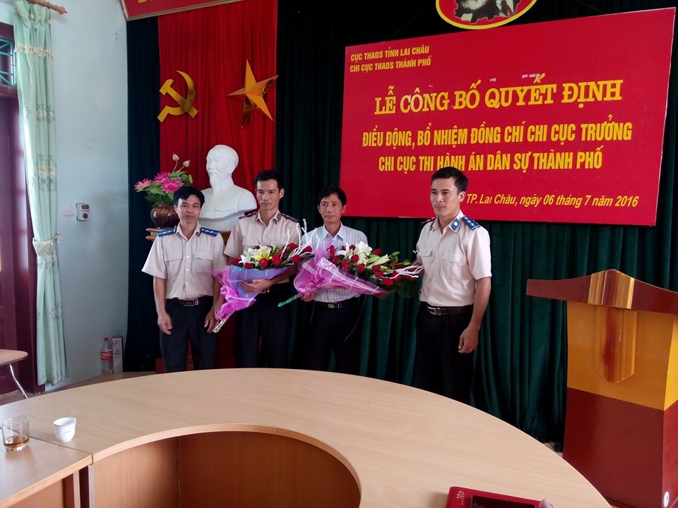 Thừa ủy quyền của Lãnh đạo Cục THADS, đồng chí Phạm Thị Việt Thanh – Chánh văn phòng đã công bố Quyết định số 711/QĐ-TCTHADS ngày 29/6/2016 của Tổng cục THADS về việc điều động đồng chí Nguyễn Duy Phiên, Chấp hành viên sơ cấp, Chi cục trưởng Chi cục THADS huyện Tam Đường đến công tác tại Chi cục THADS thành phố Lai Châu, bổ nhiệm ông Nguyễn Duy Phiên giữ chức vụ Chi cục trưởng Chi cục THADS thành phố Lai Châu kể từ ngày 01/7/2016.