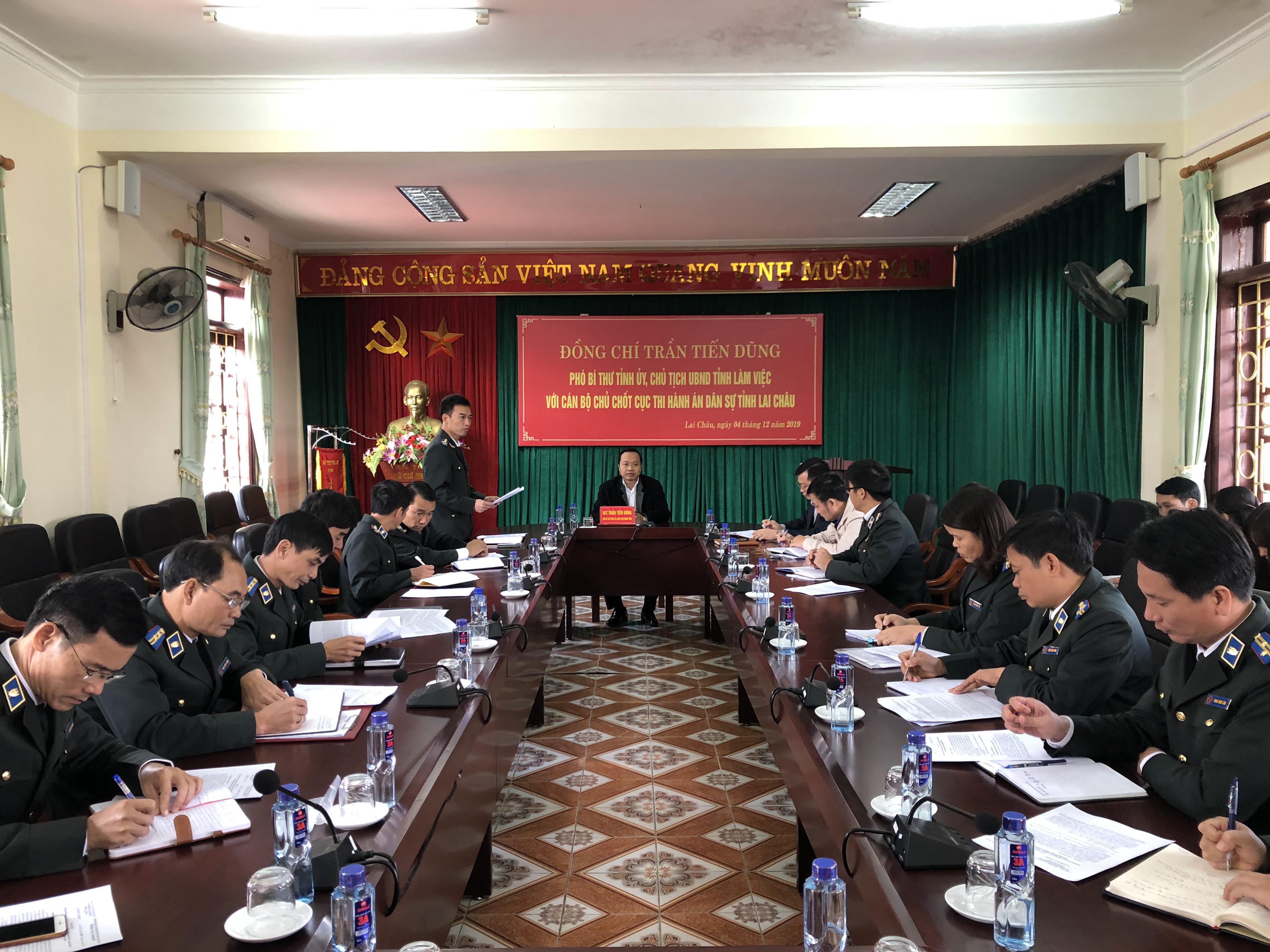 Ngày 04 tháng 12 năm 2019 tại Cục Thi hành án dân sự tỉnh Lai Châu, đồng chí Trần Tiến Dũng, Phó Bí thư Tỉnh ủy - Chủ tịch Uỷ ban nhân dân tỉnh Lai Châu đã có buổi làm việc với Cục Thi hành án dân sự tỉnh Lai Châu, tham dự buổi làm việc có đại diện Lãnh đạo Văn phòng UBND tỉnh, đại diện Lãnh đạo Sở Tư pháp, các đồng chí lãnh đạo Cục, Lãnh đạo các Phòng chuyên môn thuộc Cục, Chi cục trưởng Chi cục THADS các huyện, thành phố cùng toàn thể công chức, người lao động thuộc Cục.