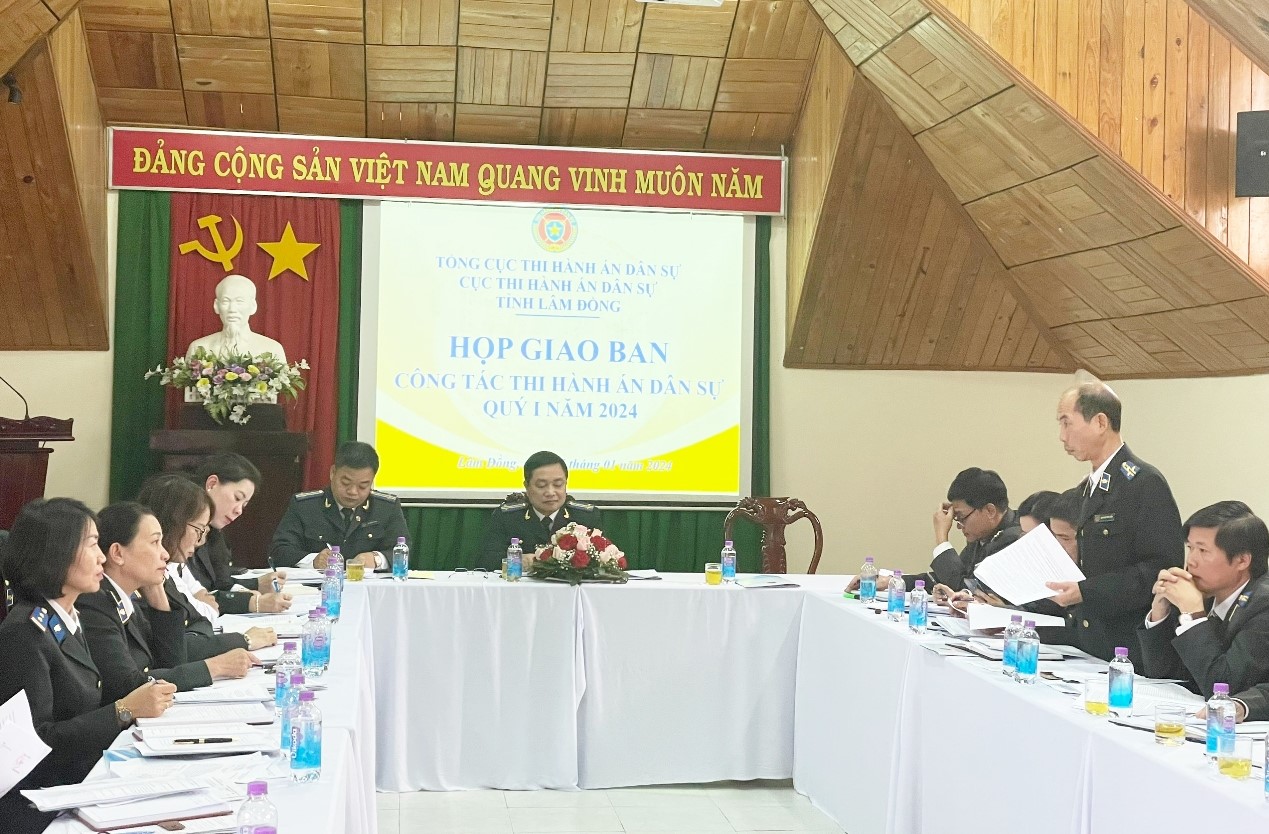 Ngày 05/01/2024, Cục Thi hành án dân sự tỉnh Lâm Đồng tổ chức họp giao ban công tác thi hành án dân sự, theo dõi thi hành án hành chính 3 tháng đầu năm 2024. Cục trưởng Đặng Đình Quyền chủ trì cuộc họp. Tham dự giao ban có các đồng chí lãnh đạo Cục, Lãnh đạo các Phòng chuyên môn và Lãnh đạo các Chi cục Thi hành án dân sự huyện, thành phố.