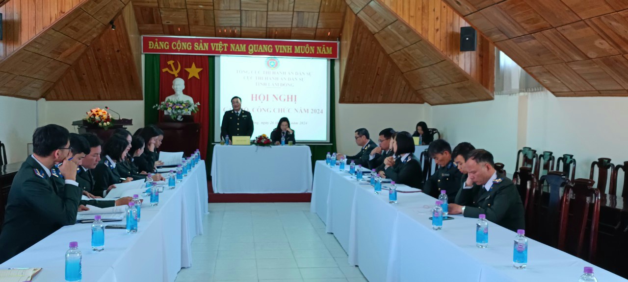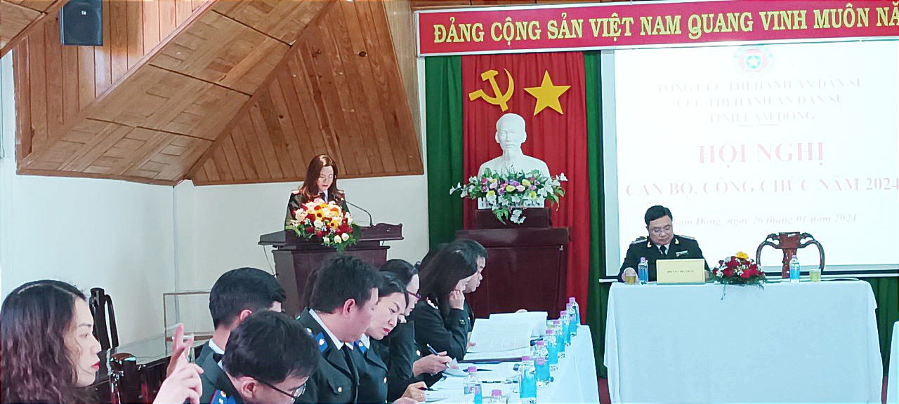 Ngày 26/01/2024, Cục Thi hành án dân sự tỉnh Lâm Đồng tổ chức Hội nghị công chức, người lao động năm 2024. Đồng chí Đặng Đình Quyền – Bí thư Chi bộ, Cục trưởng và đồng chí Lê Thị Hồng Ngọc – Trưởng phòng Nghiệp vụ và tổ chức thi hành án, Chủ tịch Công đoàn chủ trì Hội nghị.
