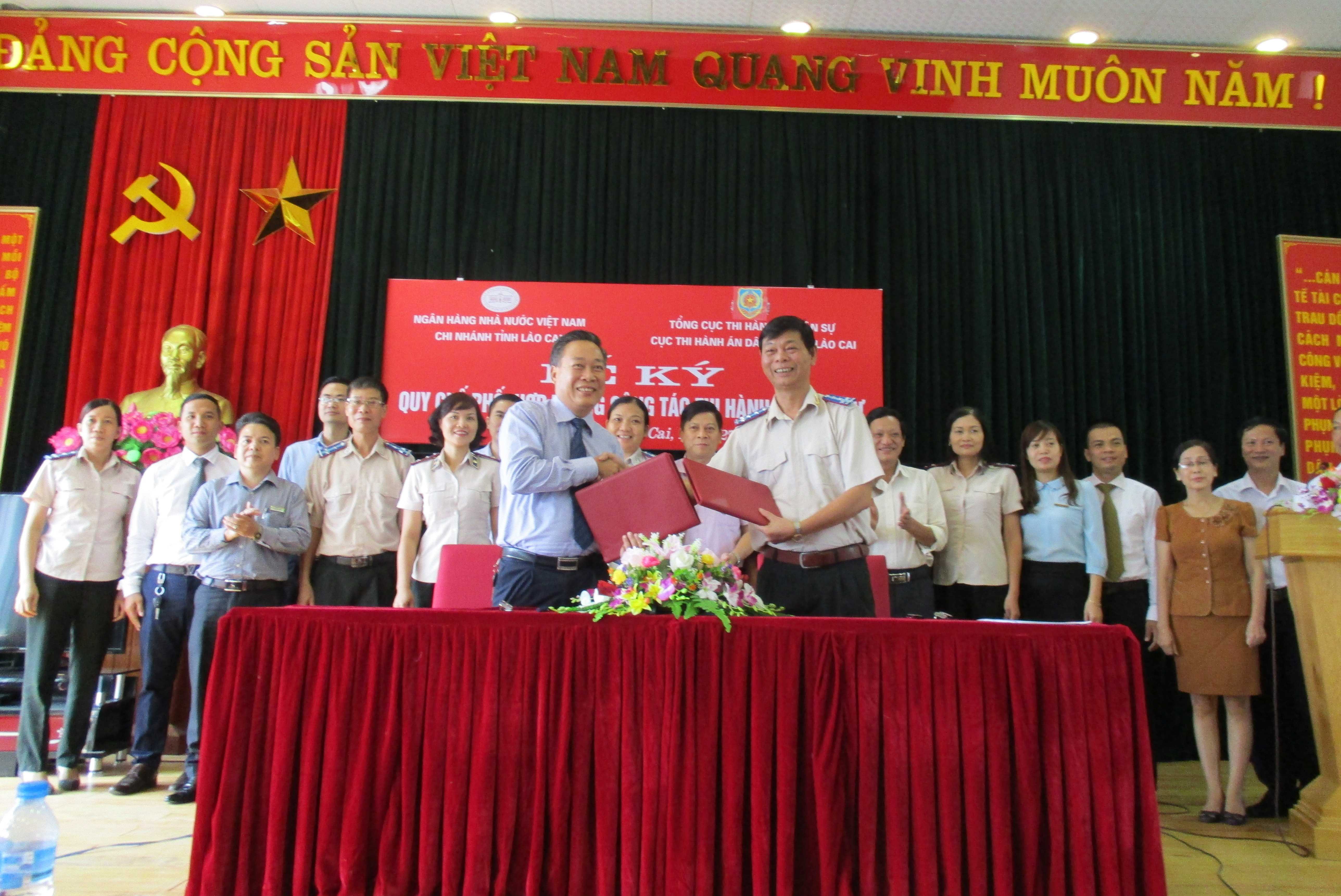 Với sự thống nhất cao giữa hai cơ quan, buổi Lễ ký đã diễn ra thành công tốt đẹp. Đây là dấu mốc quan trọng trong quan hệ phối hợp, tạo cơ sở đẩy nhanh tiến độ, nâng cao chất lượng, xử lý dứt điểm các vụ việc thi hành án dân sự liên quan đến hoạt động tín dụng, ngân hàng trên địa bàn, góp phần thực hiện có hiệu quả các Nghị quyết về phát triển kinh tế- xã hội hàng năm của Quốc hội, của Chính phủ và của tỉnh Lào Cai.