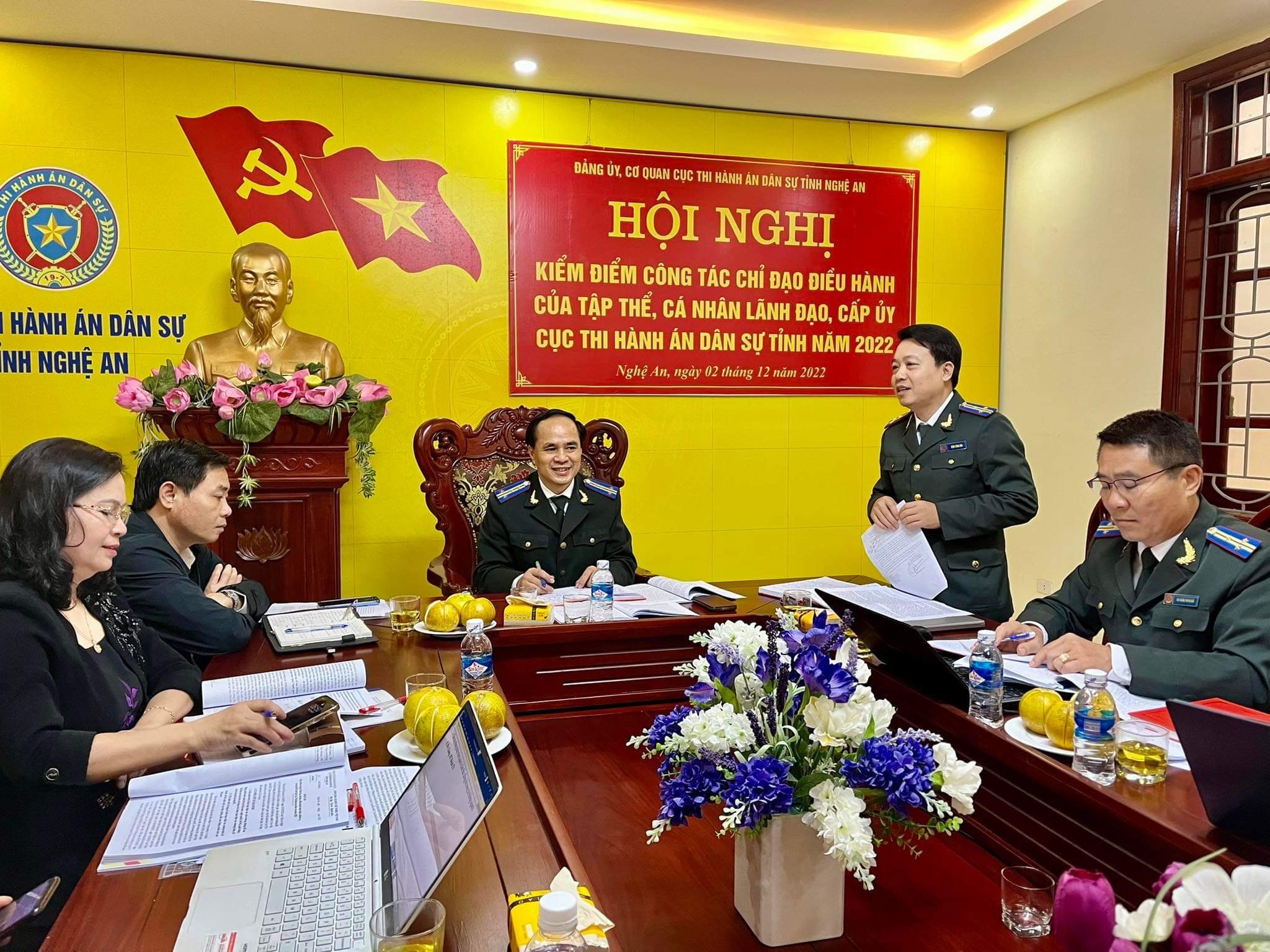 Thực hiện Kế hoạch số 131-KH/TU ngày 24/10/2022 của Tỉnh ủy Nghệ An về việc kiểm điểm tập thể, cá nhân và đánh giá, xếp loại, khen thưởng đối với tổ chức đảng, đảng viên, tập thể, cá nhân cán bộ lãnh đạo, quản lý các cấp năm 2022 và Hướng dẫn số 07- HD/ĐUK, ngày 28/10/2022 của Ban Thường vụ Đảng ủy Khối các cơ quan tỉnh Nghệ An về việc tổng kết công tác xây dựng Đảng năm 2022. Ngày 02/12/2022, Đảng ủy, Cơ quan Cục Thi hành án dân sự (THADS) tỉnh Nghệ An tổ chức Hội nghị kiểm điểm công tác chỉ đạo điều hành của tập thể, cá nhân lãnh đạo, cấp ủy Cục THADS tỉnh Nghệ An.