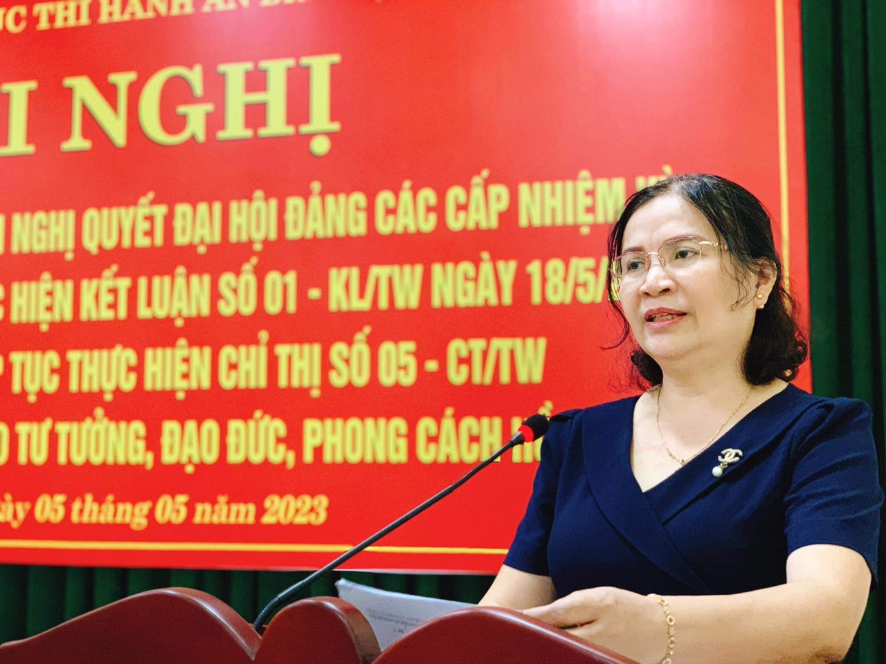 Đồng chí Phan Sỹ Hùng, Phó Bí thư Đảng ủy, báo cáo kết quả 02 năm thực hiện Kết luận số 01-KL/TW ngày 18/5/2021 của Bộ Chính trị về tiếp tục thực hiện Chỉ thị số 05-CT/TW "Về đẩy mạnh việc học tập và làm theo tư tưởng, đạo đức, phong cách Hồ Chí Minh". Việc thực hiện Kết luận 01 gắn với thực hiện Nghị quyết trung ương 4 (Khóa XII) và các quy định về trách nhiệm Nêu gương đã trở thành một nội dung học tập thường xuyên của các Chi bộ và đảng viên trong toàn đảng bộ. Trong đó tiêu biểu là Đảng bộ Cục THADS tỉnh đã xây dựng mô hình “Dân vận khéo trong công tác THADS” và được công nhận là mô hình điển hình và vận dụng thực hiện có hiệu quả trong lãnh đạo thực hiện nhiệm vụ chuyên môn.
