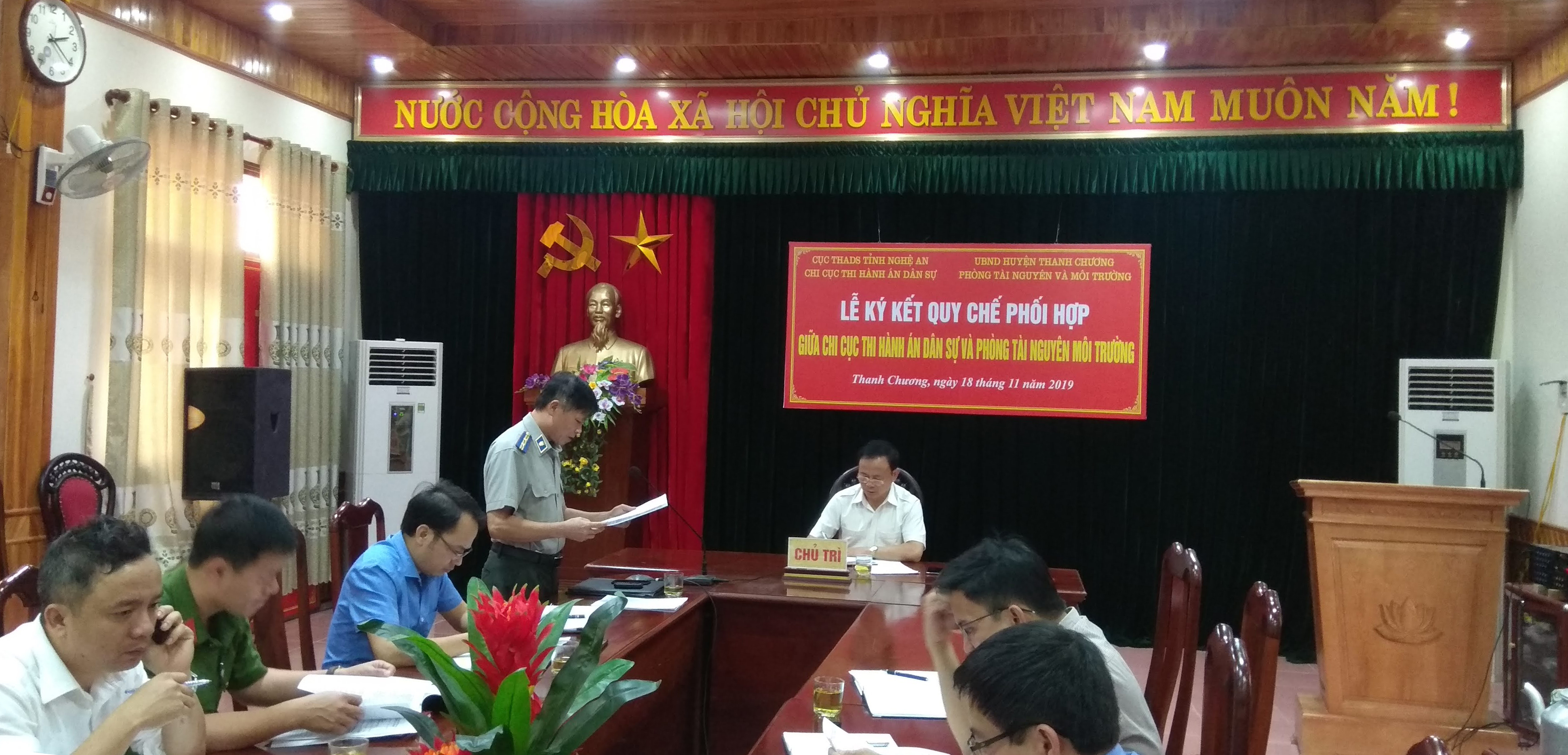 Ngày 18/11/2019, dưới sự chủ trì của đồng chí Nguyễn Hữu Hiền, Ủy viên Ban Thường vụ Huyện uỷ, Phó Chủ tịch UBND, Trưởng Ban Chỉ đạo THADS huyện, Ban Chỉ đạo THADS huyện Thanh Chương đã tổ chức cuộc họp định kỳ và bàn, chỉ đạo một số vụ việc khó khăn, phức tạp. Tham gia cuộc họp có các thành viên Ban Chỉ đạo THADS huyện, đại diện lãnh đạo Viện kiểm sát nhân dân, Chủ tịch UBMTTQ huyện, cùng toàn thể cán bộ, công chức Chi cục THADS huyện.
