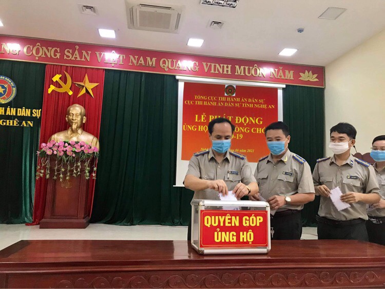 Hưởng ứng lời kêu gọi của Mặt trận Tổ Quốc Việt Nam tỉnh Nghệ An, sáng ngày 03/6/2021, sau lễ chào cờ đầu tháng,Đảng uỷ, Lãnh đao Cục Thi hành án dân sự tỉnh Nghệ Anđã tổ chức Lễ phát động ủng hộ Qũy phòng,chống dịch Covid-19 năm 2021.Tham gia lễ phát động có sự tham gia của BCH Đảng bộ, Lãnh đạo Cục và toàn thể cán bộ, công chức, người lao động của Cục THADS tỉnh Nghệ An.