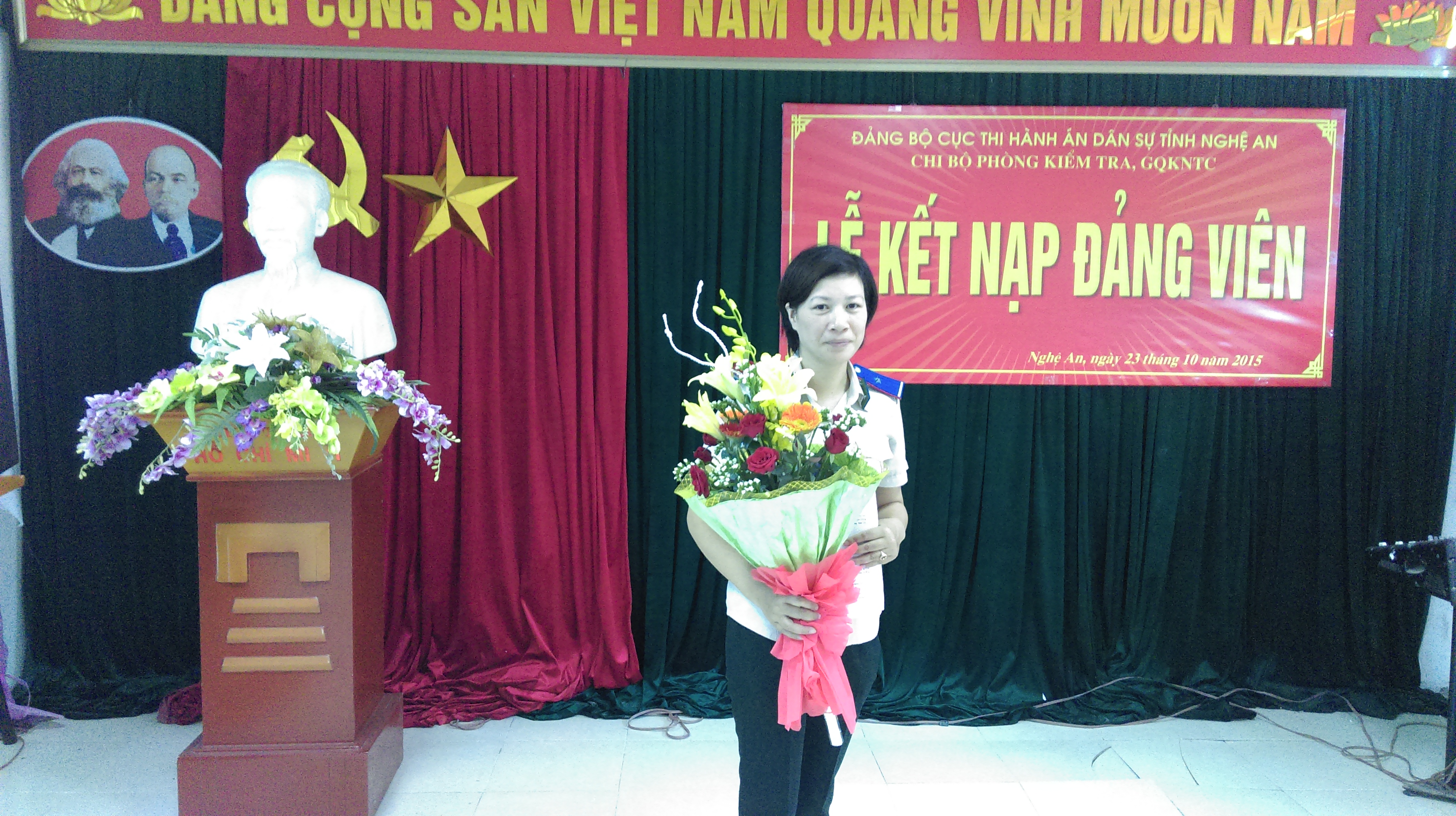 Được sự đồng ý của Đảng ủy Cục Thi hành án dân sự tỉnh Nghệ An, chiều ngày 23 tháng 10 năm 2015 tại Hội trường cơ quan Cục Thi hành án dân sự tỉnh Nghệ An, Chi bộ Phòng Kiểm tra, giải quyết khiếu nại, tố cáo đã tổ chức Lễ kết nạp Đảng cho quần chúng ưu tú Phan Thị Hồng Thu.Tới dự Lễ có đồng chí Hoàng Thị Thu Trang, Bí thư Đảng ủy và đồng chí Phan Sỹ Hùng, Phó Bí thư Đảng ủy Cục Thi hành án dân sự tỉnh, Bí thư Chi bộ Phòng Tổ chức cán bộ và toàn thể các đảng viên trong Chi bộ.