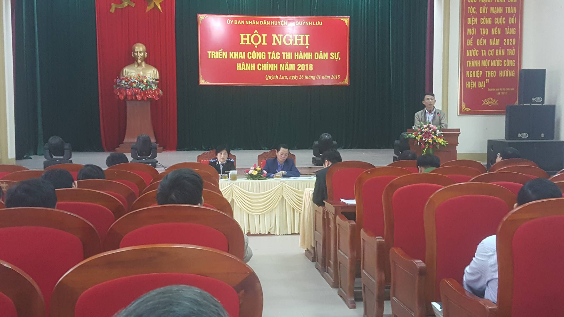 Ngày 26/01/2018, UBND huyện Quỳnh Lưu, tỉnh Nghệ An tổ chức Hội nghị triển khai công tác Thi hành án dân sự năm 2018. Tham dự và chỉ đạo Hội nghị có đ/c Nguyễn Văn Việt - Phó Cục trưởng Cục Thi hành án tỉnh, đồng chí Hồ Ngọc Dũng - Uỷ viên BTV Huyện uỷ, Phó Chủ tịch UBND, Trưởng Ban Chỉ đạo THADS huyện. Hội nghị còn có sự tham dự của đại diện lãnh đạo HĐND huyện, lãnh đạo Tòa án nhân dân, Viện kiểm sát nhân dân huyện, các thành viên Ban Chỉ đạo Thi hành án dân sự huyện, đại diện lãnh đạo, Trưởng Công an và công chức Tư pháp của 33 xã, thị trấn trên địa bàn huyện, cùng toàn thể cán bộ, công chức, người lao động cơ quan Thi hành án dân sự huyện Quỳnh Lưu, tỉnh Nghệ An.