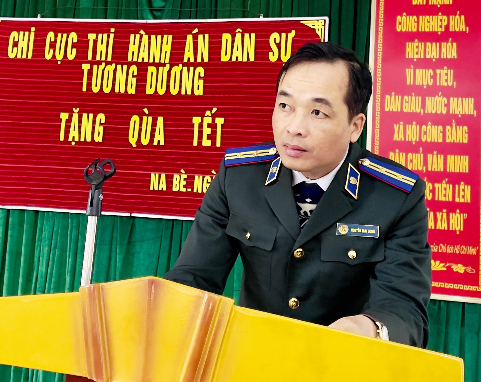 Đ/c Nguyễn Mai Long, Chi Cục trưởng Chi cục Thi hành án Tương Dương phát biểu tại buổi trao quà
