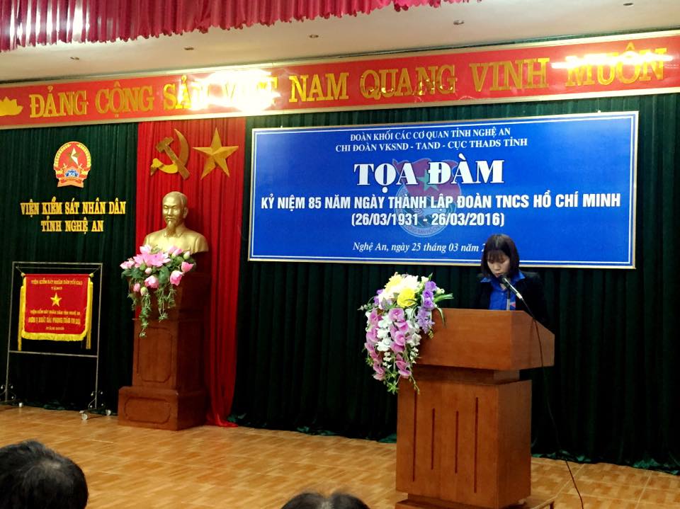 Chiều ngày 25/3/2016, tại Hội trường VKS nhân dân tỉnh, ba chi đoàn TAND tỉnh, VKSND tỉnh và Cục THADS tỉnh đã tổ chức Tọa đàm, giao lưu kết nghĩa chào mừng kỷ niệm 85 năm ngày thành lập Đoàn TNCS Hồ Chí Minh.