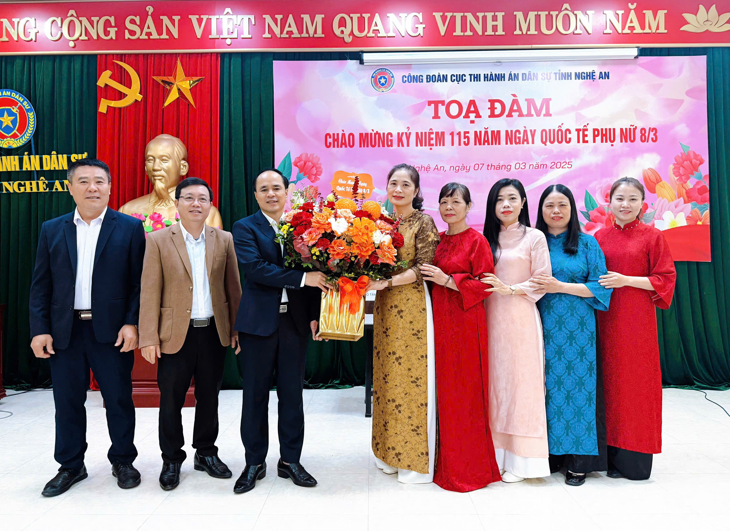 Tại buổi toạ đàm, tập thể Đảng ủy- Công đoàn cơ quan đã thay mặt toàn thể anh em trong cơ quan tặng lẵng hoa chúc mừng và gửi những lời chúc tốt đẹp đến chị em phụ nữ trong cơ quan, thật nhiều sức khỏe, bình an, nhiều niềm vui, hạnh phúc trong cuộc sống, mong rằng nữ công chức, người lao động của cơ quan sẽ tiếp tục phát huy truyền thống của phụ nữ Việt Nam, đồng hành cùng tập thể cơ quan nỗ lực, phấn đấu hoàn thành xuất sắc các nhiệm vụ được giao trên mọi cương vị công tác. Hy vọng với tinh thần vui tươi, phấn khởi, đoàn kết trách nhiệm sẽ là động lực giúp chị em trong cơ quan luôn hoàn thành xuất sắc nhiệm vụ góp phần xây dựng cơ quan THADS Nghệ An ngày càng phát triển vững mạnh.