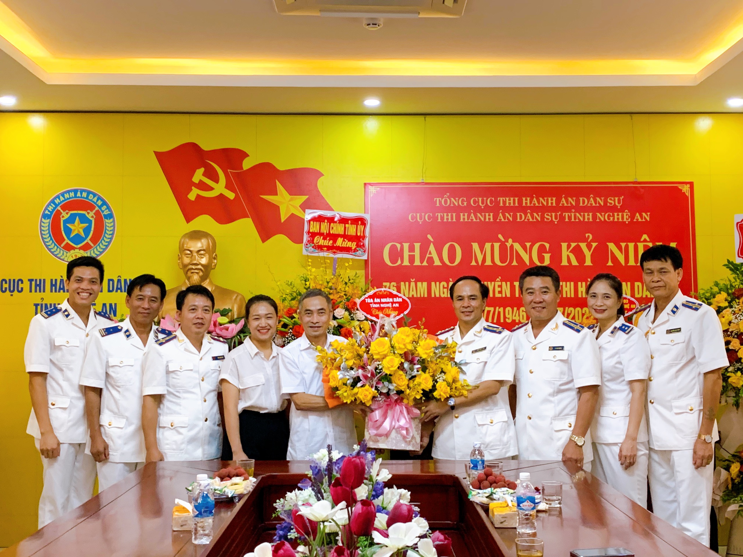 Nhân dịp kỉ niệm 76 năm ngày truyền thống Ngành THADS (19/7/1946 - 19/7/2022), Cục THADS tỉnh Nghệ An rất vui mừng đón nhận những tình cảm, sự quan tâm của lãnh đạo Bộ Tư pháp, lãnh đạo Tổng cục THADS, lãnh đạo Ban nội chính Tỉnh uỷ, các ngành trong khối nội chính, các sở ngành, tổ chức tín dụng ngân hàng, bàn bè, đồng nghiệp đã trực tiếp tặng hoa, gửi lời chúc mừng động viên CBCC,NLĐ các cơ quan THADS tỉnh Nghệ An.