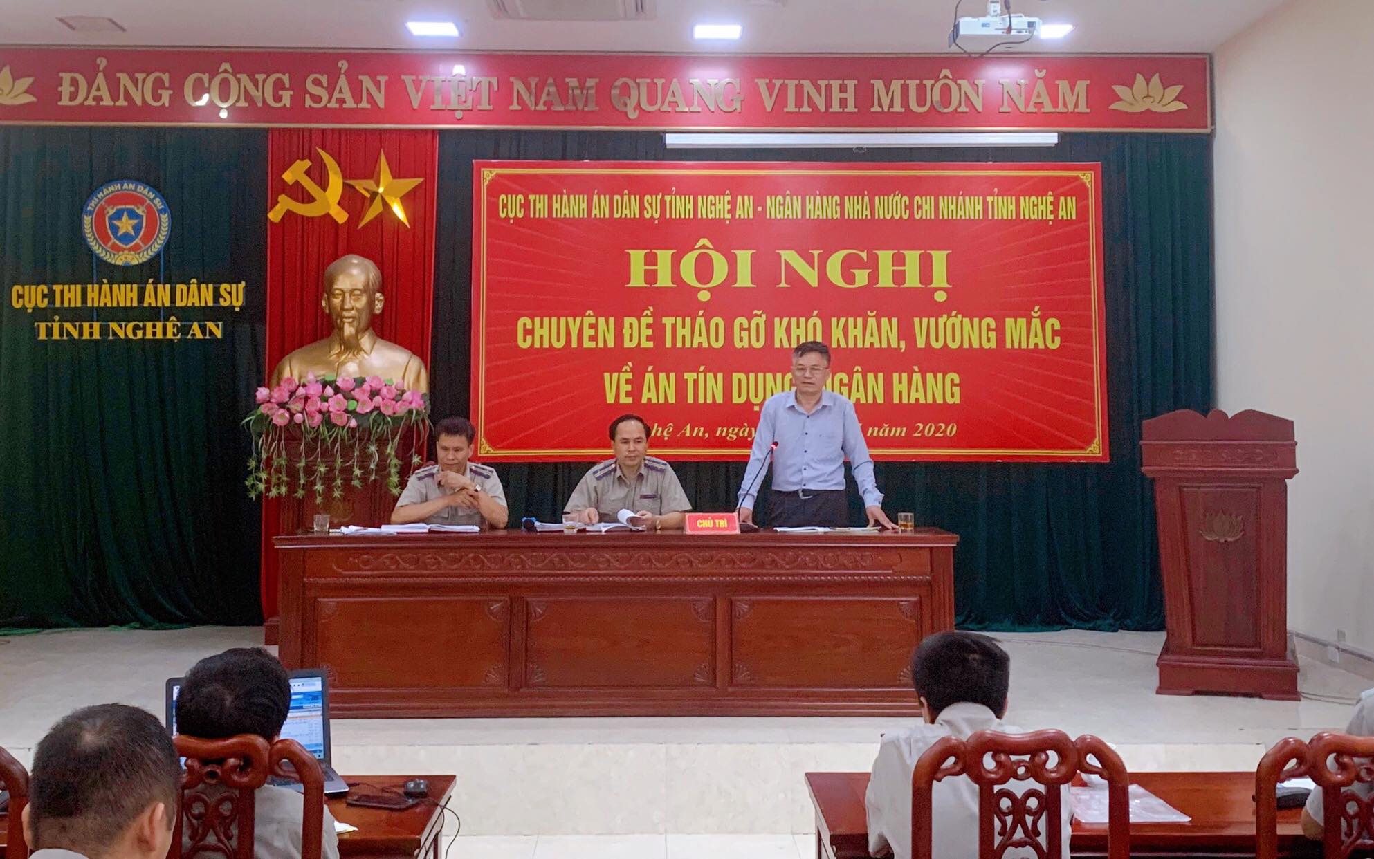 Ngày 09/7/2020 Cục THADS tỉnh Nghệ An và Ngân hàng Nhà nước Chi nhánh tỉnh Nghệ An đã chủ trì tổ chức Hội nghị chuyên đề tháo gỡ khó khăn vướng mắc về thi hành án liên quan đến hoạt động tín dụng, ngân hàng trên địa bàn tỉnh Nghệ An. Tham dự Hội nghị có sự tham gia của Lãnh đạo Cục THADS tỉnh, đại diện lãnh đạo Ngân hàng Nhà nước Chi nhánh tỉnh Nghệ An, Tổ xử lý nợ xấu của Cục THADS tỉnh, Lãnh đạo và Chấp hành viên một số Chi cục THADS cấp huyện có liên quan và đại diện29 tổ chức tín dụng, ngân hàng có trụ sở hoạt động trên địa bàn tỉnh.