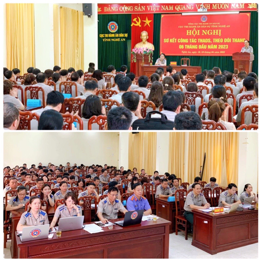 Thực hiện Kế hoạch công tác năm 2023, ngày 19/4/2023, Cục THADS tỉnh Nghệ An tổ chức Hội nghị sơ kết công tác THADS, theo dõi THAHC 6 tháng đầu năm 2023. Tham dự Hội nghị có các đồng chí Lãnh đạo Cục, lãnh đạo các phòng chuyên môn, lãnh đạo các Chi cục THADS và toàn thể Chấp hành viên, Thẩm tra viên, Kế toán của các cơ quan THADS trên địa bàn tỉnh Nghệ An.