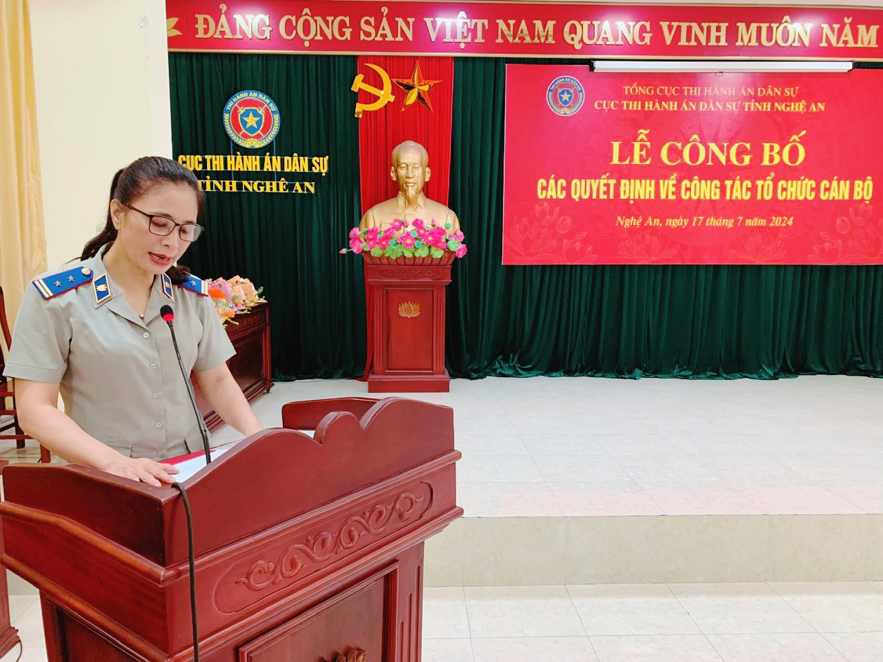 Sáng ngày 17/7/2024, Cục Thi hành án dân sự (THADS) tỉnh Nghệ An đã tổ chức Lễ công bố các quyết định của Tổng cục THADS về việc điều động, bổ nhiệm công chức giữ chức vụ lãnh đạo đối với 05 đồng chí và giao phụ trách đơn vị đối với 01 đồng chí.