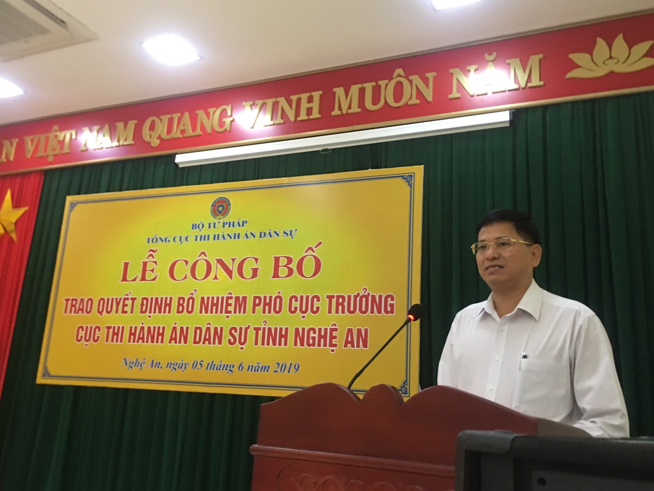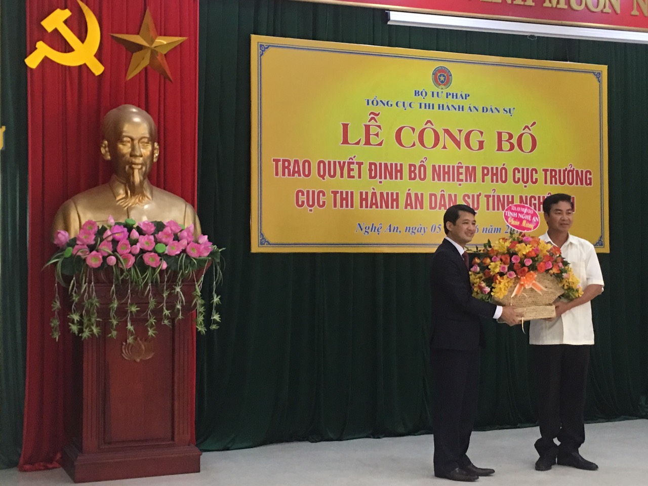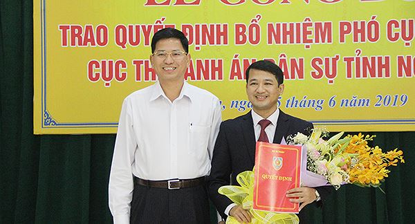 Tại buổi lễ, đồng chí Nguyễn Văn Lực, Phó Tổng cục trưởng Tổng cục Thi hành án dân sự đã trao Quyết định số 579/QĐ-TCTHADS ngày 21/5/2019 của Tổng Cục trưởng Tổng cục Thi hành án dân sự về việc bổ nhiệm ông Nguyễn Hoài An, Chấp hành viên trung cấp Cục Thi hành án dân sự tỉnh Nghệ An giữ chức vụ Phó Cục trưởng Cục Thi hành án dân sự tỉnh Nghệ An từ ngày 01/6/2019.