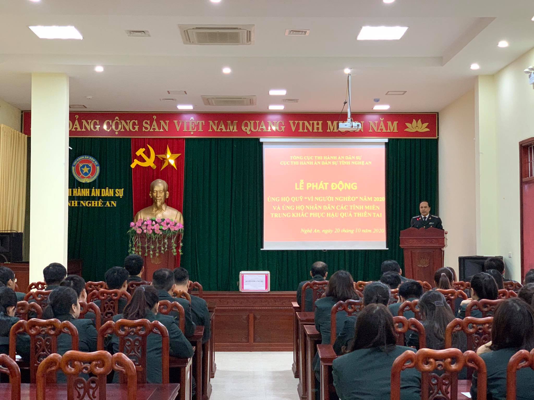 Chiều ngày20/10, hưởng ứng lời kêu gọi của Ủy ban Mặt trận Tổ quốc tỉnh Nghệ An, Cục Thi hành án dân sự tỉnh Nghệ An đã tổ chức Lễ phát động ủng hộ nhân dân các tỉnh miền Trung khắc phục hậu quả thiên tai và ủng hộ Quỹ “Vì người nghèo” năm 2020. Buổi lễ có sự tham gia của toàn thể Lãnh đạo, công chức, người lao động Cục Thi hành án dân sự tỉnh Nghệ An. Đồng chí Phạm Quốc Nam, Bí thư Đảng ủy, Cục trưởng Cục Thi hành án dân sự tỉnh chủ trì buổi lễ.