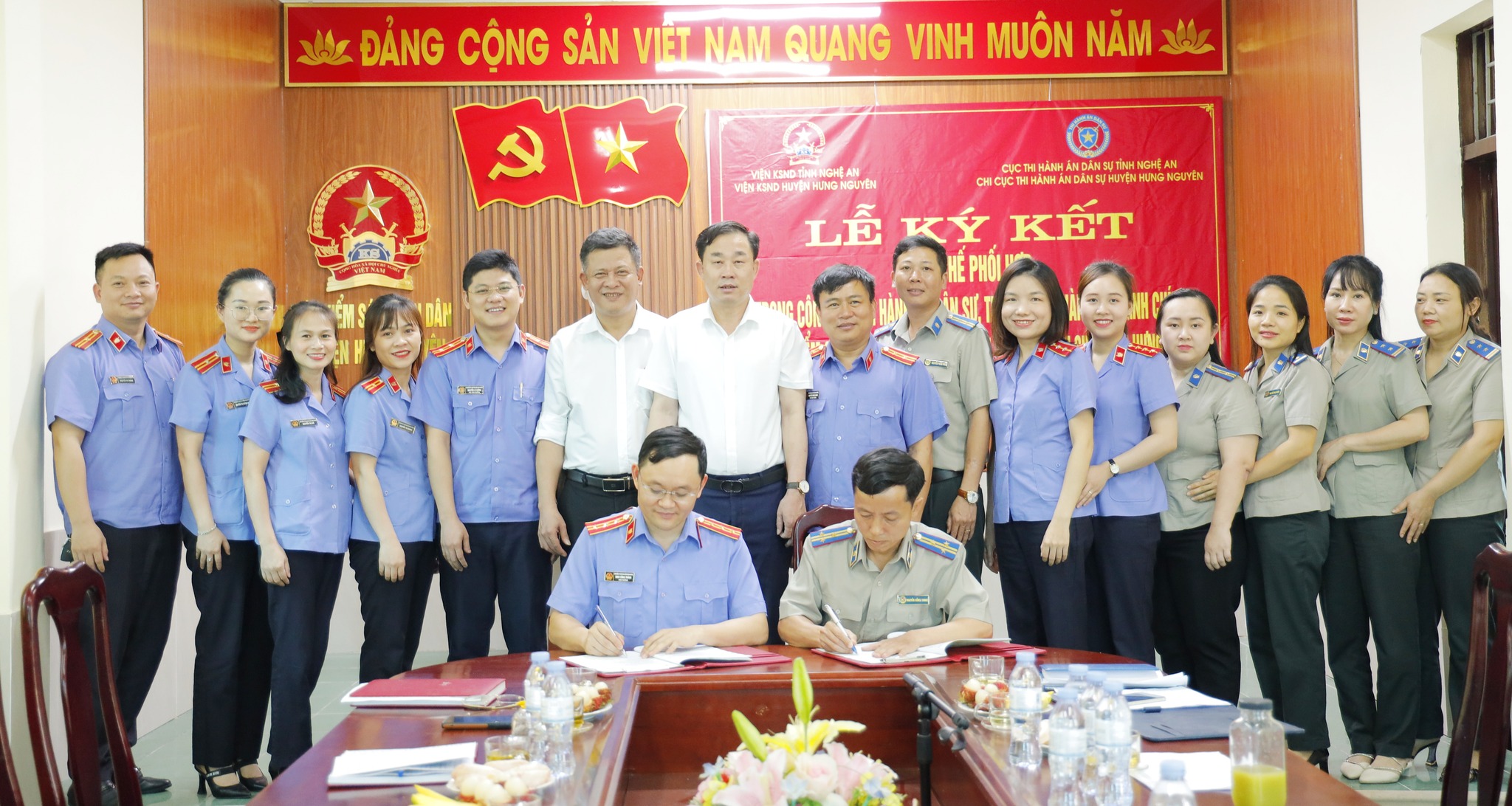 Tham dự có các đồng chí: Nguyễn Hữu Hà - Phó Chủ tịch UBND huyện, Thường trực Ban chỉ đạo THADS - HC; Đinh Công Thành - Viện trưởng Viện kiểm sát Nhân dân huyện; Nguyễn Hồng Trung - Chi cục Trưởng Chi cục thi hành án Dân sự huyện; Lâm Quốc Tú - Chánh án Tòa án Nhân dân huyện; Các đồng chí Kiểm sát viên, Chấp hành viên, Thẩm tra viên, cán bộ hai cơ quan ký kết.
