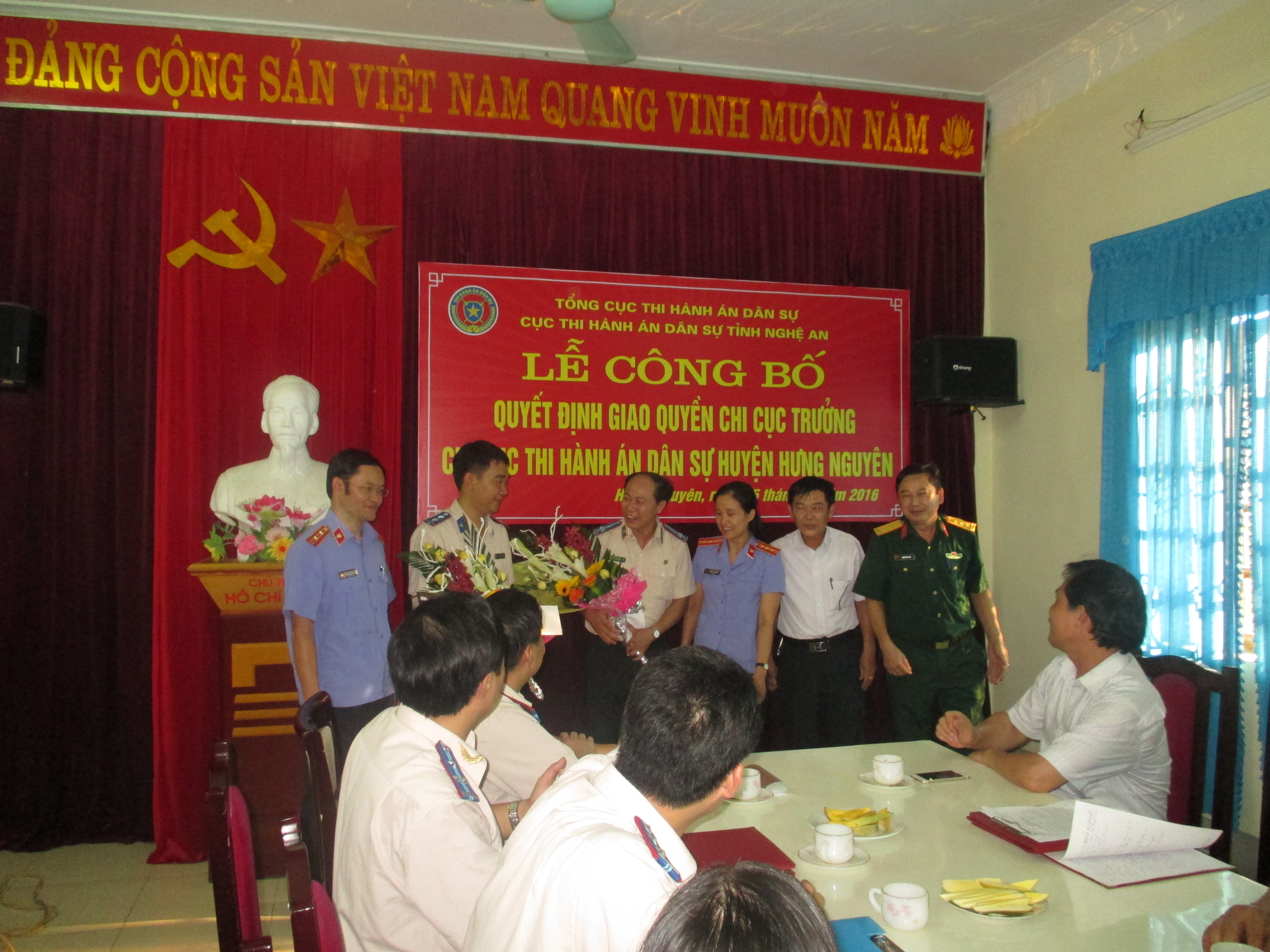Chiều ngày 25 tháng 7 năm 2016 tại Chi cục Thi hành án dân sự huyện Hưng Nguyên, Cục Thi hành án dân sự tỉnh Nghệ An tổ chức Lễ công bố Quyết định giao Quyền Chi cục trưởng Chi cục Thi hành án dân sự huyện Hưng Nguyên cho đ/c Phan Anh Tú. Dự Lễ công bố Quyết định có đồng chí Trần Văn Thu – Cục trưởng, đồng chí Phạm Quốc Nam – Phó cục trưởng, đồng chí Nguyễn Đức Tình – Chánh Văn phòng, Cục Thi hành án dân sự tỉnh Nghệ An; Về phía lãnh đạo địa phương có đồng chí Hồ Văn Hiệp – Ủy viên BTV Huyện ủy - Phó Chủ tịch UBND huyện Hưng Nguyên, đồng chí Nguyễn Văn Tú – Phó Chủ tịch Hội đồng nhân dân huyện Hưng Nguyên, cùng các đồng chí đại diện lãnh đạo các cơ quan trong khối nội chính huyện và tập thể cán bộ, công chức Chi cục Thi hành án dân sự huyện Hưng Nguyên.