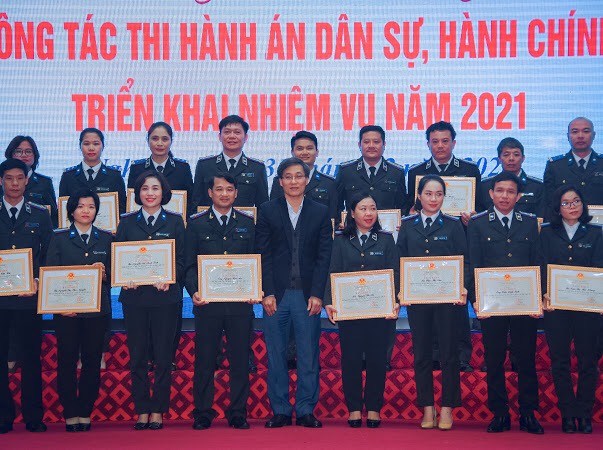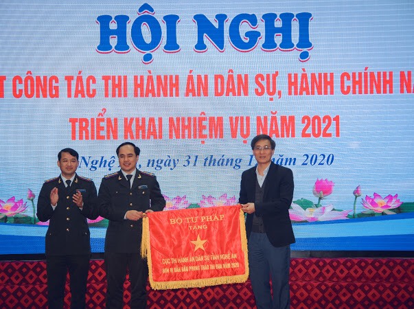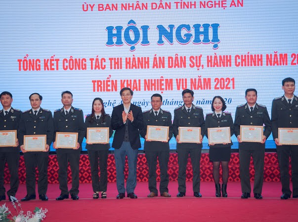 Để ghi nhận, biểu dương những thành tích quan trọng đã đạt được của các tập thể, cá nhân ngành Thi hành án dân sự tỉnh Nghệ An trong năm 2020, tại Hội nghị, thay mặt Lãnh đạo Bộ Tư pháp, đồng chí Nguyễn Khánh Ngọc, Bí thư Ban cán sự Đảng, Thứ trưởng Bộ Tư pháp đã trao tặng “Cờ thi đua ngành Tư pháp” năm 2020 cho tập thể Cục Thi hành án dân sự tỉnh Nghệ An và Chi cục Thi hành án dân sự thị xã Hoàng Mai, tỉnh Nghệ An; trao tặng danh hiệu “Tập thể lao động xuất sắc” năm 2020 cho 10 tập thể và trao tặng Bằng khen của Bộ trưởng Bộ Tư pháp cho 05 tập thể, 17 cá nhân.
