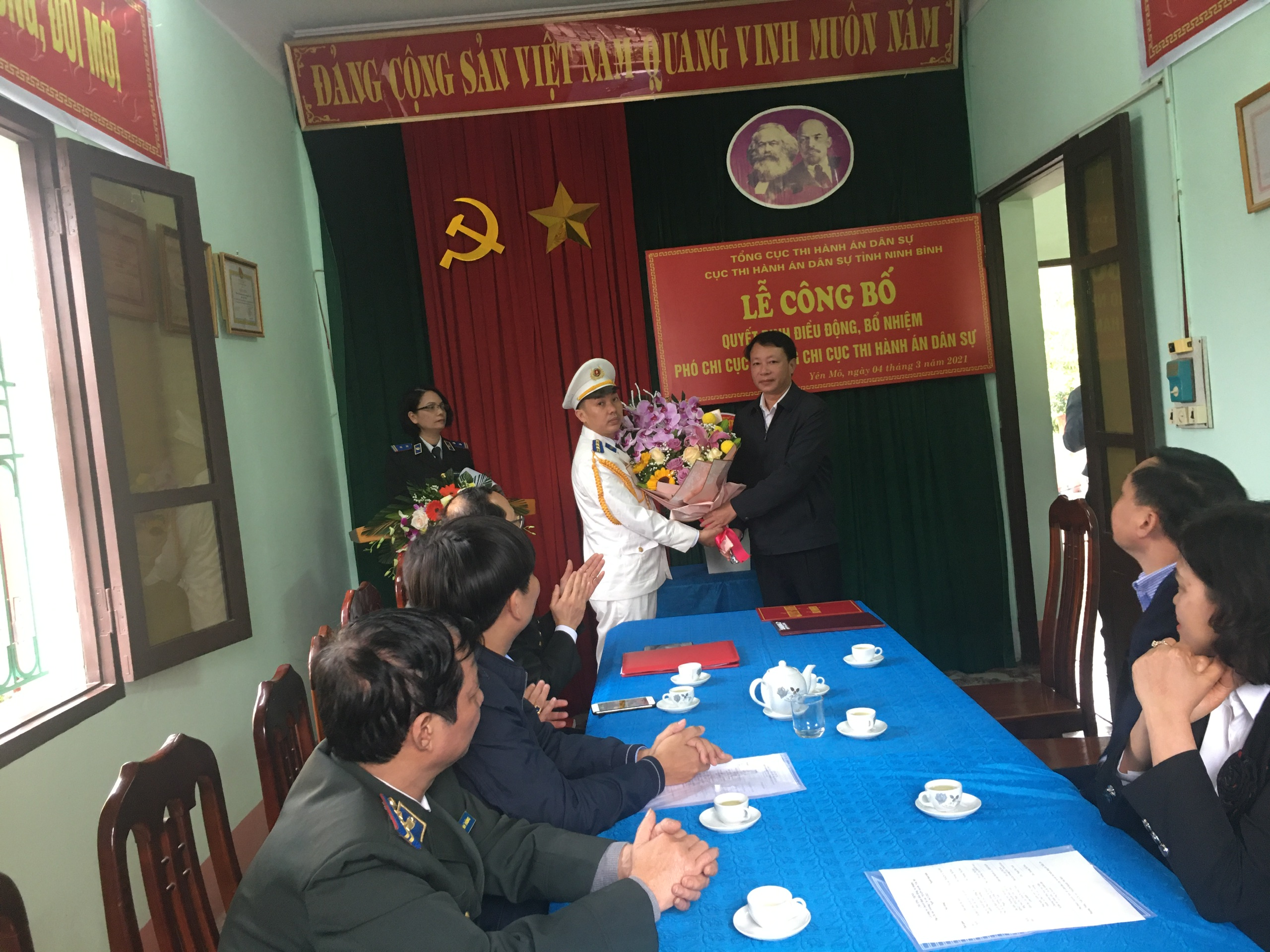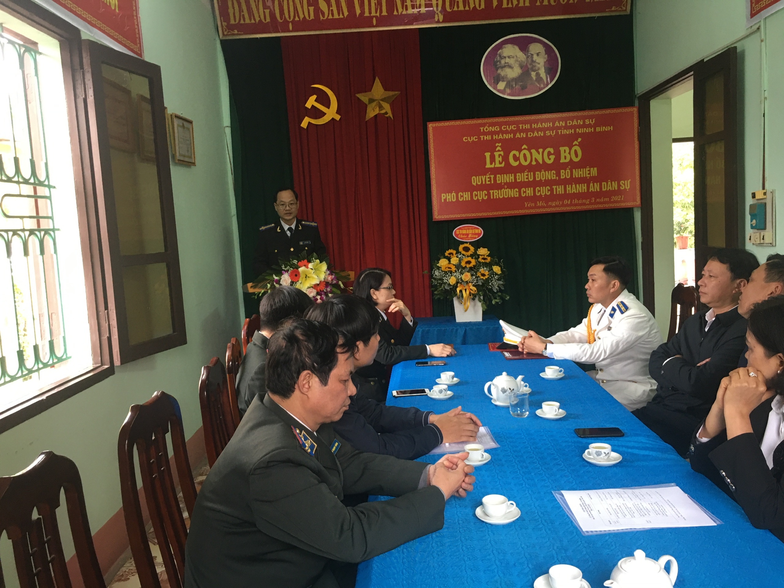 Thực hiện quyết định của Cục trưởng Cục Thi hành án dân sự tỉnh Ninh Bình về việc điều động, bổ nhiệm công chức giữ chức vụ lãnh đạo, chiều ngày 04/3/2021, Cục Thi hành án dân sự tỉnh Ninh Bình long trọng tổ chức Lễ công bố Quyết định điều động, bổ nhiệm chức vụ Phó Chi cục trưởng Chi cục Thi hành án dân sự huyện Yên Mô, tỉnh Ninh Bình đối với đồng chí Phạm Văn Tuấn, Chấp hành viên sơ cấp Chi cục Thi hành án dân sự thành phố Tam Điệp.