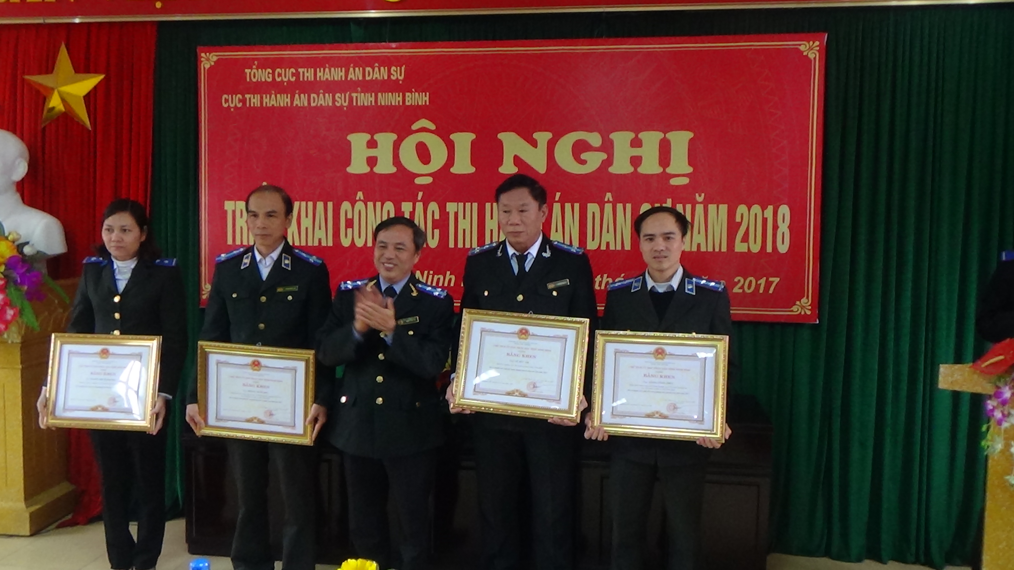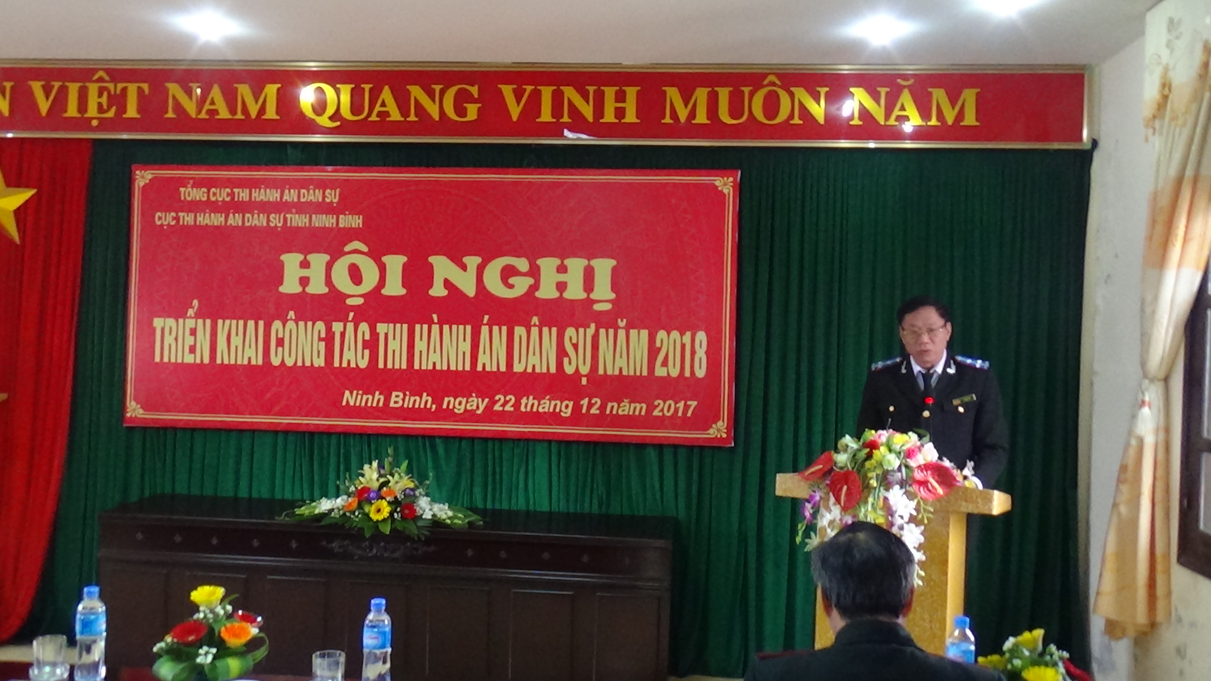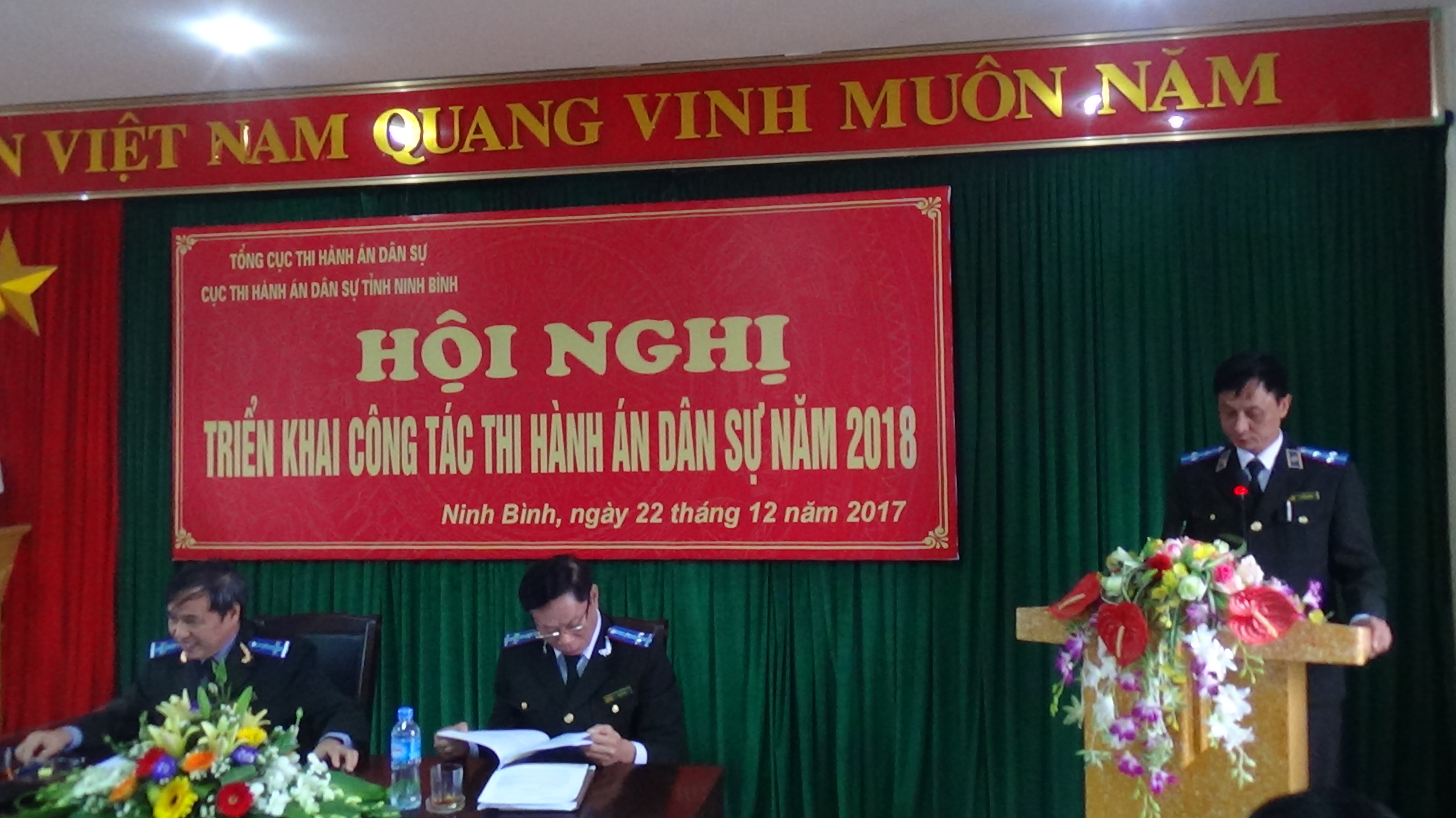 Sáng ngày 22/12/2017, Cục thi hành án dân sự( THADS) tỉnh Ninh Bình tổ chức Hội nghị triển khai công tác năm 2018. Dự và chỉ đạo hội nghị có đồng chí Phạm Xuân Túy, Phó ban chỉ đạo THADS, Cục trưởng Cục THADS tỉnh. Cùng dự hội nghị có đồng chí Vũ Đức Am, Phó Cục trưởng Cục thi hành án dân sự tỉnh. Dự Hội nghị còn có đại biểu khách mời là các đ/c nguyên là Cục trưởng, Phó Cục Trưởng Cục THADS tỉnh. Các đ/c Lãnh đạo Phòng cảnh sát THAHS và hỗ trợ tư pháp Công an tỉnh Ninh Bình.Tham dự Hội nghị còn có các đ/c Trưởng, Phó các phòng chuyên môn thuộc Cục, Chi cục trưởng, Phó Chi cục trưởng các Chi cục THADS huyện, thành phố và toàn thể cán bộ, công chức và người lao động ngành THADS tỉnh Ninh Bình.