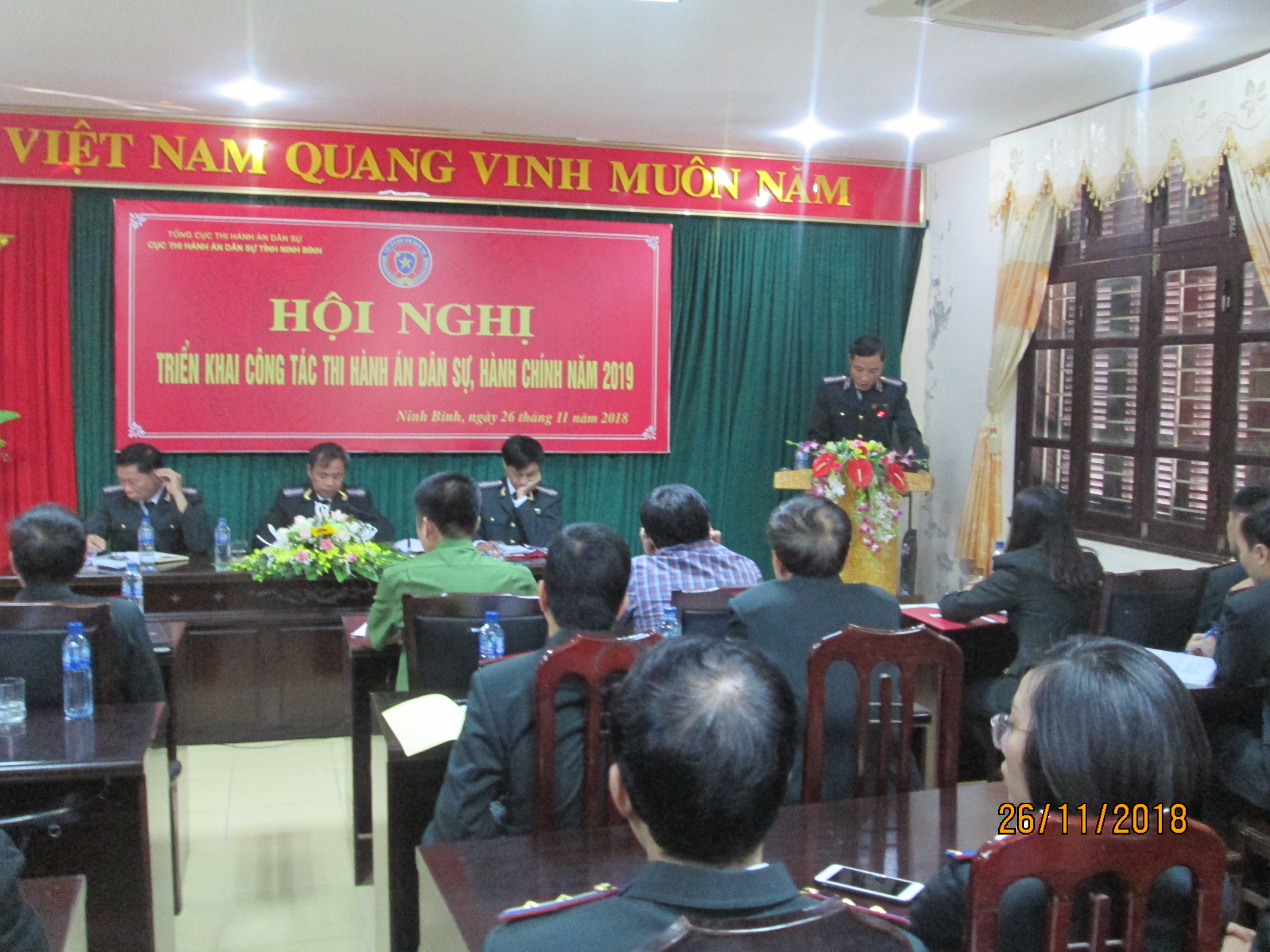 Kết luận hội nghị, đồng chí Phạm Xuân Túy Cục trưởng Cục THADS tỉnh đã trả lời những đề xuất, kiến nghị khó khăn vướng mắc của các Chi cục THADS huyện, thành phố trực thuộc và chia sẻ những kinh nghiệm trong công tác quản lý, chỉ đạo điều hành. Đồng thời Cục trưởng cũng yêu cầu Trưởng các phòng chuyên môn, các Chi cục trưởng Chi cục THADS trực thuộc thực hiện ngay một số nhiệm vụ: (1) Triển khai thực hiện tốt chương trình công tác năm 2019 của Cục THADS tỉnh, nâng cao chất lượng hiệu quả công tác tổ chức thi hành án, đảm bảo đạt và vượt các chỉ tiêu thi hành án dân sự, hành chính được giao năm 2019; (2) Tập trung chỉ đạo quyết liệt việc thực hiện các chỉ tiêu nhiệm vụ ngay từ những tháng đầu năm công tác, đề ra các giải pháp cụ thể để tổ chức thi hành dứt điểm các vụ việc có điều kiện thi hành, những vụ việc thi hành án liên quan đến tín dụng ngân hàng, nâng cao hiệu quả công tác thu hồi tài sản trong các vụ án hình sự về kinh tế, tham nhũng... Quá trình thi hành án phải đảm bảo chặt chẽ về thủ tục không để phát sinh khiếu nại; (3) Làm tốt công tác kiểm tra, chú trọng công tác tự kiểm tra để kịp thời phát hiện và có biện pháp chấn chỉnh, khắc phục sai phạm; (4) Thực hiện nghiêm túc các quy định của cơ chế một cửa, tạo sự công khai minh bạch, lấy sự hài lòng của người dân làm tiêu chí đánh giá kết quả công tác. Nâng cao hiệu quả chế độ báo cáo thống kê thi hành án dân sự và phần mềm quản lý quá trình thụ lý tổ chức thi hành án và báo cáo thống kê thi hành án dân sự; (5) Tiếp tục kiện toàn tổ chức bộ máy, đội ngũ công chức thi hành án, tăng cường công tác giáo dục chính trị, tư tưởng rèn luyện phẩm chất đạo đức, cải tiến lề lối làm việc; kỷ cương kỷ luật công vụ; (6) xây dựng các cơ quan THADS tỉnh Ninh Bình trong sạch, vững mạnh; tích cực hưởng ứng và đảy mạnh phong trào thi đua do ngành tư pháp và địa phương phát động nhằm tạo động lực và khí thế để công chức toàn ngành phấn đấu hoàn thành xuất sắc nhiệm vụ được giao trong năm 2019 và các năm tiếp theo.