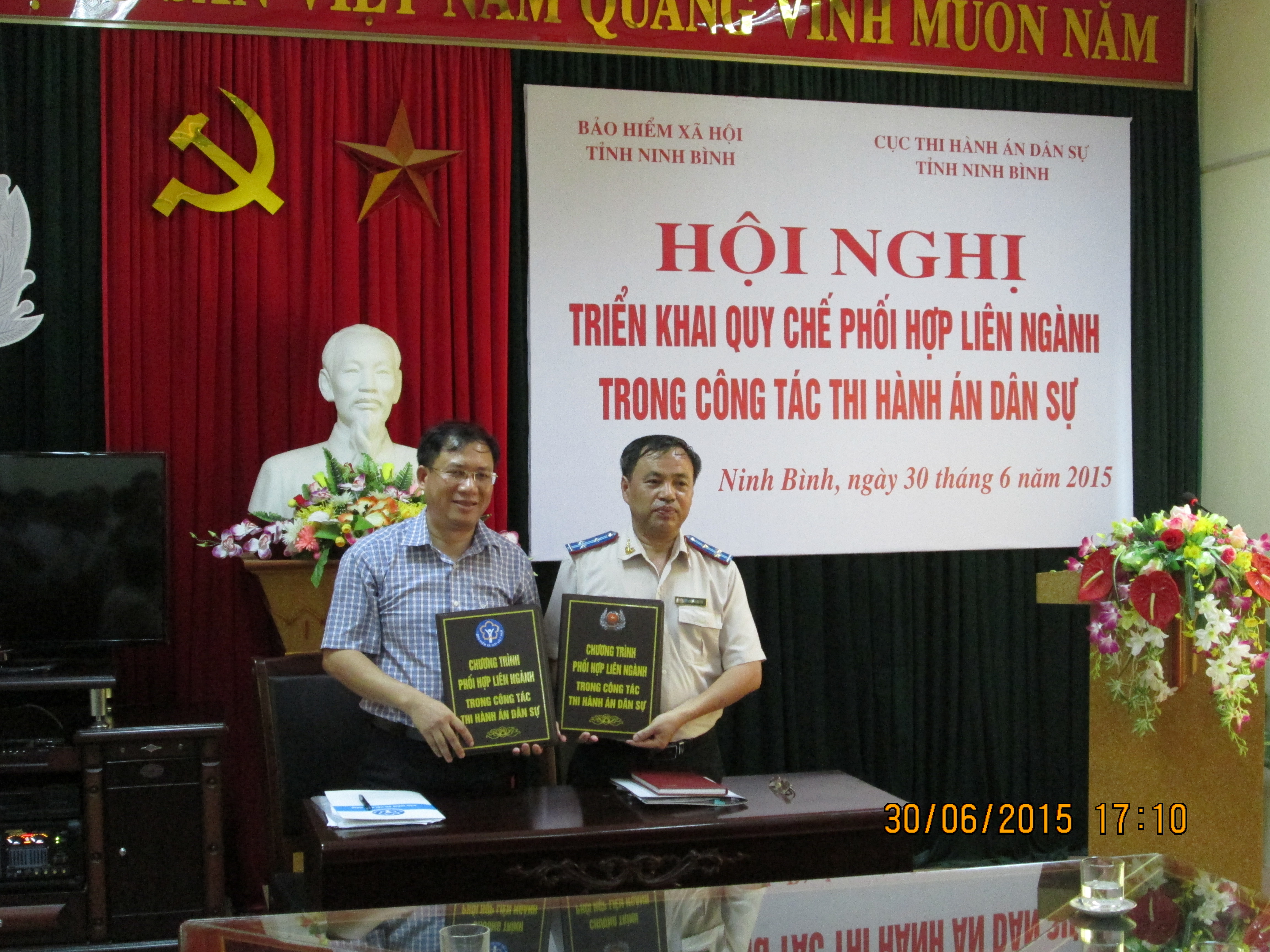 Thực hiện chỉ đạo của Bảo hiểm xã hội Việt Nam và Tổng cục Thi hành án dân sự, ngày 30/6/2015 tại Cục Thi hành án dân sự tỉnh Ninh Bình, Bảo hiểm xã hội tỉnh Ninh Bình và Cục Thi hành án dân sự tỉnh Ninh Bình đã tổ chức Hội nghị triển khai Quy chế phối hợp giữa Bảo hiểm xã hội Việt Nam và Tổng cục Thi hành án dân sự trong công tác thi hành án dân sự, tham dự Hội nghị có Lãnh đạo Cục, Ban Giám đốc Bảo hiểm xã hội tỉnh, Trưởng các Phòng chuyên môn, Chi cục trưởng, Giám đốc Bảo hiểm xã hội các huyện, thành phố thuộc tỉnh.