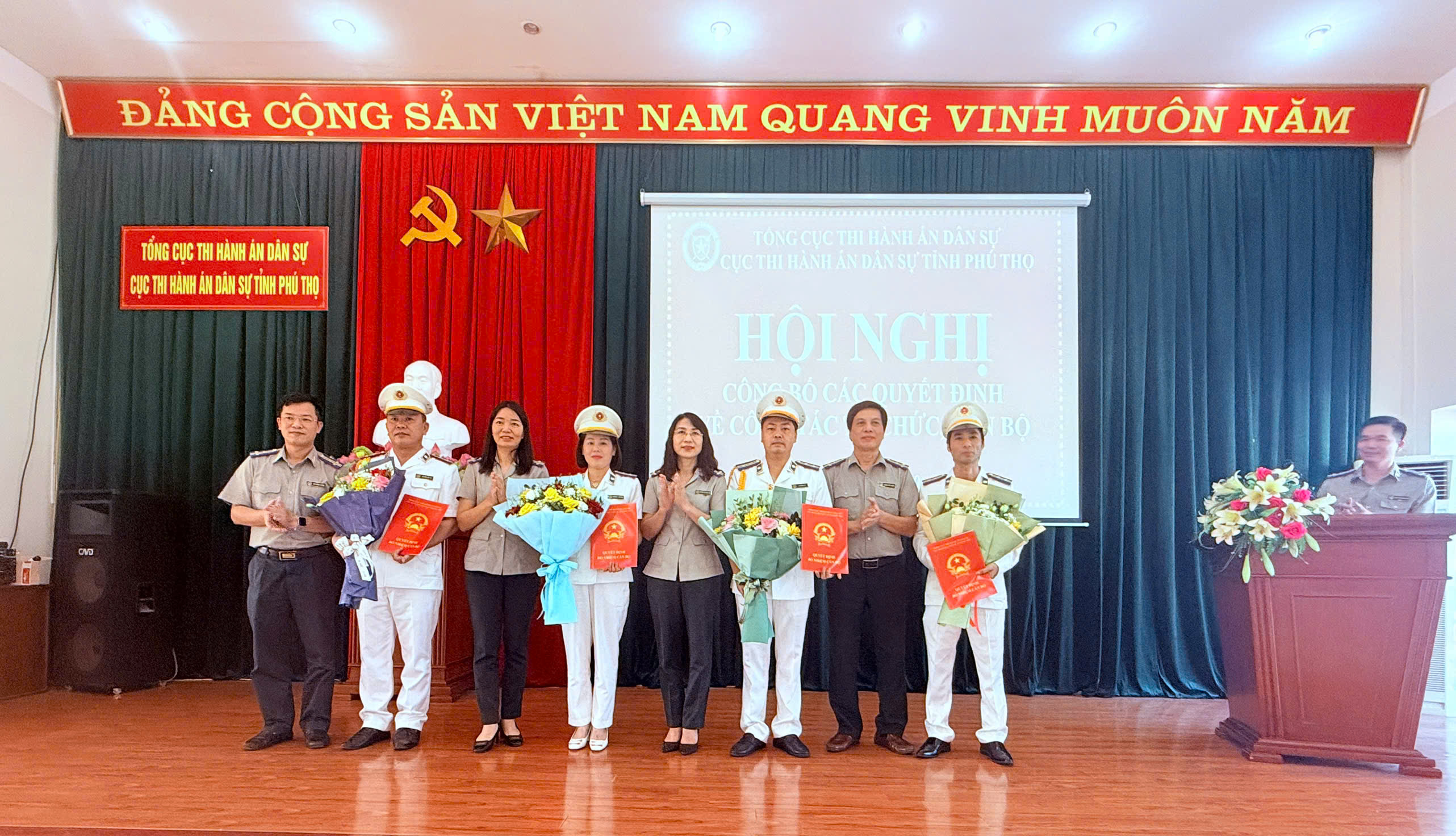 Chiều ngày 02/10/2024, Cục Thi hành án dân sự (THADS) tỉnh Phú Thọ tổ chức Hội nghị công bố Quyết định của Tổng cục trưởng Tổng cục THADS và Cục trưởng Cục THADS tỉnh Phú Thọ về công tác cán bộ. Dự buổi hội nghị có đồng chí Nguyễn Thị Thu Chung, Bí thư chi bộ, Cục trưởng Cục THADS tỉnh, các đồng chí Phó Cục trưởng Cục THADS tỉnh, các đồng chí Lãnh đạo phòng và tương đương thuộc Cục, Lãnh đạo các Chi cục THADS huyện Tân Sơn, Thanh Ba, Thanh Sơn, Thanh Thủy, Yên Lập và thành phố Việt Trì.