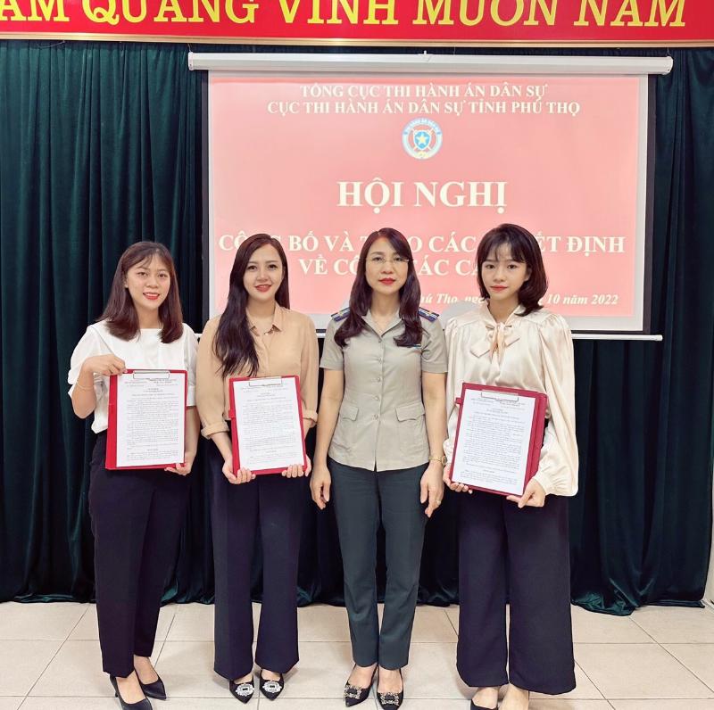 Chiều ngày 31/10/2022, Cục Thi hành án dân sự (THADS) tỉnh Phú Thọ đã tổ chức Hội nghị công bố và trao các quyết định vể công tác cán bộ. Dự hội nghị có đồng chí Nguyễn Thị Thu Chung - Bí thư Chi bộ, Cục trưởng Cục THADS tỉnh, đồng chí Quách Hữu Quang - Phó Bí thư Chi bộ, Phó Cục trưởng Cục THADS tỉnh, các đồng chí Trưởng phòng chuyên môn thuộc Cục, đại diện lãnh đạo Chi cục THADS huyện Thanh Ba và các đồng chí công chức mới được tuyển dụng.
