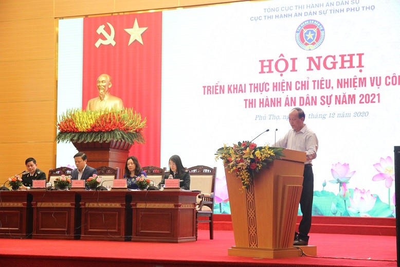 Thực hiện chỉ đạo của Bộ tư pháp, Tổng cục Thi hành án dân sự và được sự đồng ý của thường trực Tỉnh uỷ, UBND tỉnh. Chiều 14/12/2020 Cục Thi hành án dân sự tỉnh Phú Thọ tổ chức Hội nghị triển khai thực hiện chỉ tiêu, nhiệm vụ công tác thi hành án dân sự năm 2021. Đồng chí Trần Thị Phương Hoa, Phó Tổng cục Trưởng Tổng cục Thi hành án dân sự; đồng chí Phan Trọng Tấn, Tỉnh uỷ viên, Phó chủ tịch UBND tỉnh, Trưởng ban chỉ đạo THADS tỉnh tới dự và chỉ đạo Hội nghị.