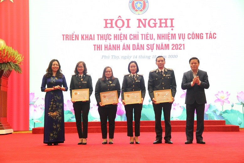 Tại Hội nghị, nhiều tập thể, cá nhân đã được trao tặng các danh hiệu khen thưởng của Bộ trưởng Bộ Tư pháp, Tổng cục trưởng Tổng cục Thi hành án dân sự và Cục trưởng Cục Thi hành án dân sự vì đã đạt thành tích xuất sắc trong công tác phối hợp, công tác chuyên môn, nghiệp vụ THADS năm 2020