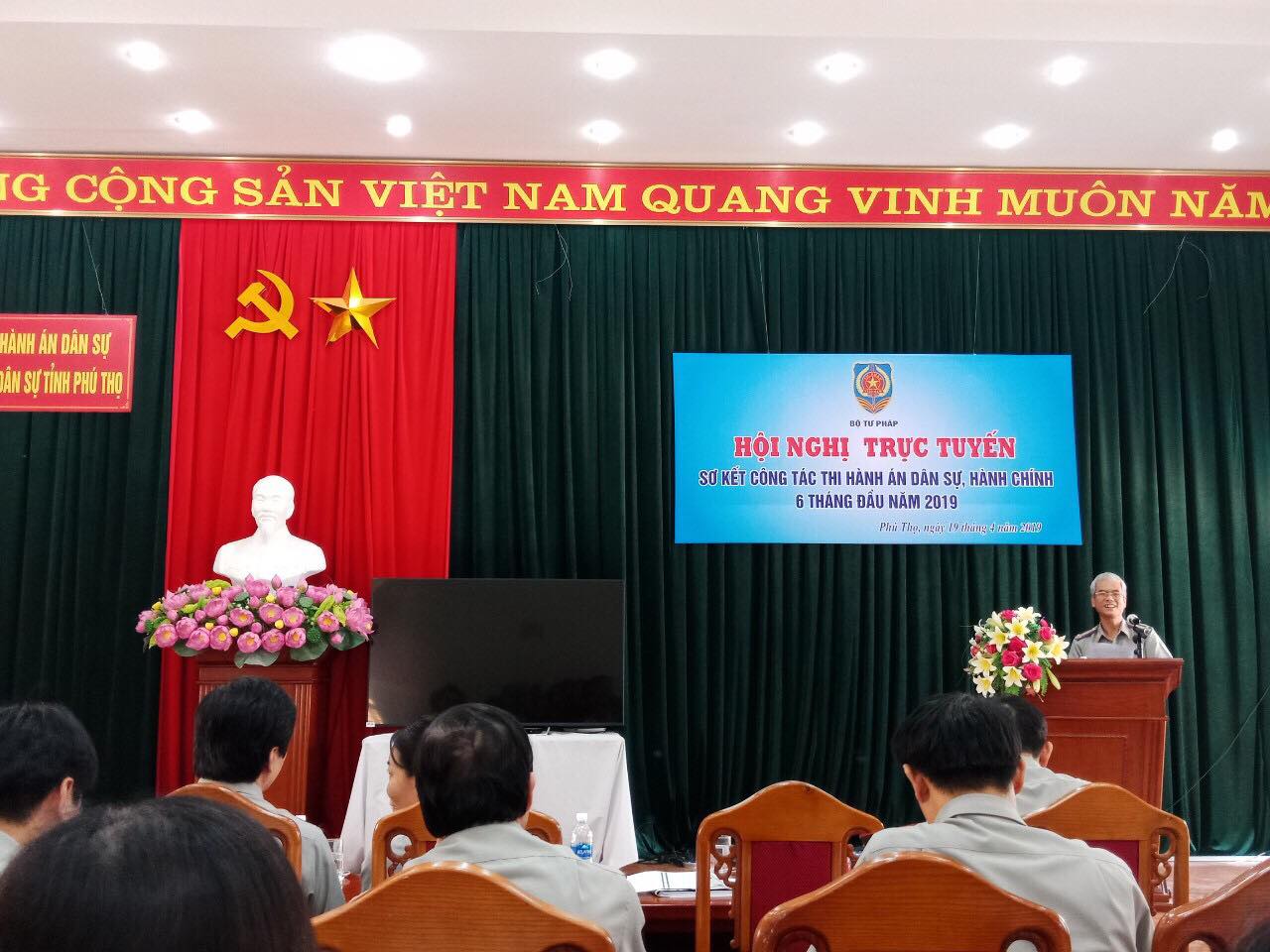 Sáng ngày 19/4/2019, tại Hà Nội, Bộ Tư pháp đã tổ chức Hội nghị sơ kết 6 tháng đầu năm 2019 công tác thi hành án dân sự (THADS) bằng hình thức trực tuyến đa phương tiện. Tại điểm cầu của tỉnh Phú Thọ, do đồng chí Nguyễn Đức Nghĩa, Bí thư chi bộ, Cục trưởng Cục Thi hành án dân sư tỉnh Phú chủ trì Hội nghị. Tham dự Hội nghị tại điểm cầu của tỉnh Phú Thọ có đại diện Lãnh đạo Phòng Thi hành án dân sự Quân khu 2; các đồng chí Phó cục trưởng; Lãnh đạo các Phòng chuyên môn thuộc Cục; Chi cục Thi hành án dân sự huyện, thành, thị, các Chấp hành viên, thẩm tra viên trong các Cơ quan Thi hành án dân sự tỉnh Phú Thọ .