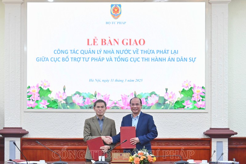 | Đồng chí Lê Xuân Hồng, Cục trưởng Cục Bổ trợ tư pháp và đồng chí Nguyễn Thắng Lợi, Quyền Tổng cục trưởng Tổng cục Thi hành án dân sự ký biên bản bàn giao công tác quản lý nhà nước về thừa phát lại. |