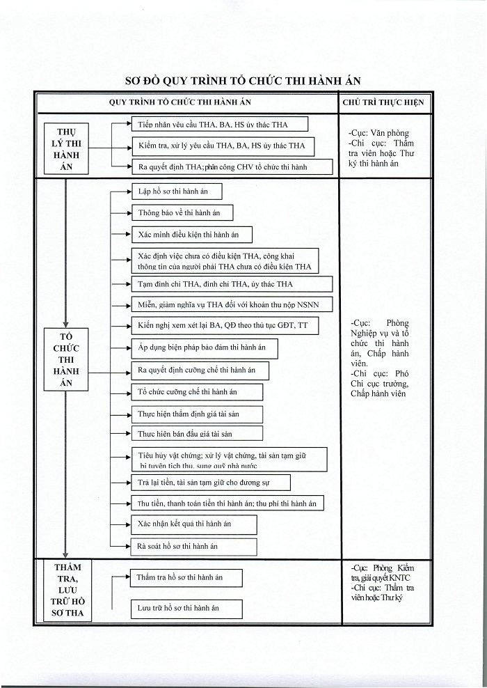 Quy trình quy định việc phân công nhiệm vụ trong nội bộ cơ quan thi hành án dân sự xuyên suốt quá trình tổ chức thi hành án dân sự, trong đó có: Việc thụ lý thi hành án, bao gồm việc tiếp nhận yêu cầu thi hành án, bản án, quyết định do Tòa án, Trọng tài thương mại, Hội đồng xử lý vụ việc cạnh tranh chuyển (sau đây gọi là bản án), hồ sơ ủy thác thi hành án; kiểm tra, xử lý yêu cầu thi hành án, bản án, hồ sơ ủy thác thi hành án; ban hành quyết định thi hành án và phân công Chấp hành viên tổ chức thi hành án; Việc tổ chức thi hành án, bao gồm quá trình tổ chức thi hành quyết định thi hành án theo quy định của pháp luật từ việc lập hồ sơ thi hành án cho đến khi tổ chức thi hành án xong; Việc thẩm tra, đưa hồ sơ thi hành án vào lưu trữ.