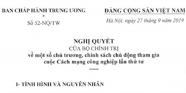 Chủ động, tích cực tham gia cuộc Cách mạng công nghiệp lần thứ tư là yêu cầu tất yếu khách quan; là nhiệm vụ có ý nghĩa chiến lược đặc biệt quan trọng, vừa cấp bách vừa lâu dài của cả hệ thống chính trị và toàn xã hội, gắn chặt với quá trình hội nhập quốc tế sâu rộng; đồng thời nhận thức đầy đủ, đúng đắn về nội hàm, bản chất của cuộc Cách mạng công nghiệp lần thứ tư để quyết tâm đổi mới tư duy và hành động, coi đó là giải pháp đột phá với bước đi và lộ trình phù hợp là cơ hội để Việt Nam bứt phá trong phát triển kinh tế-xã hội. Cuộc Cách mạng công nghiệp lần thứ tư mang lại cả cơ hội và thách thức. Ngày 27 tháng 9 năm 2019, Bộ Chính trị đã ban hành Nghị quyết số 52-NQ/TW về một số chủ trương, chính sách chủ động tham gia cuộc Cách mạng công nghiệp lần thứ tư với mục tiêu tổng quát “Tận dụng có hiệu quả các cơ hội do cuộc Cách mạng công nghiệp lần thứ tư đem lại để thúc đẩy quá trình đổi mới mô hình tăng trưởng, cơ cấu lại nền kinh tế gắn với thực hiện các đột phá chiến lược và hiện đại hoá đất nước; phát triển mạnh mẽ kinh tế số, phát triển nhanh và bền vững dựa trên khoa học - công nghệ, đổi mới sáng tạo và nhân lực chất lượng cao; nâng cao chất lượng cuộc sống, phúc lợi của người dân; bảo đảm vững chắc quốc phòng, an ninh, bảo vệ môi trường sinh thái”.