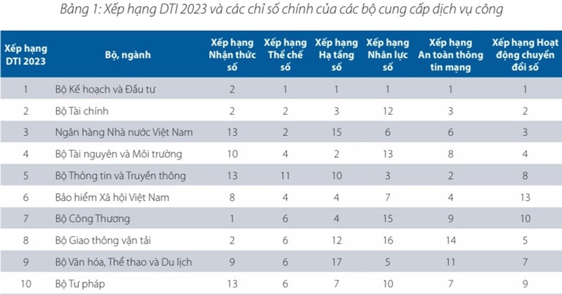 100% các bộ, tỉnh có giá trị DTI 2023 tăng so với năm 2022. Có 84/88 bộ, tỉnh (gồm 21 bộ và 63 tỉnh) tham gia đánh giá có giá trị DTI 2023 đạt từ mức 0,5 trở lên, chiếm 95,5% (năm 2022: 73,9%; năm 2021: 13,48%); vẫn còn 4 bộ, tỉnh (chiếm 4,5%) đạt dưới 0,5. Giá trị DTI 2023 cao nhất là 0,83722; Giá trị DTI 2023 thấp nhất là 0,24733.