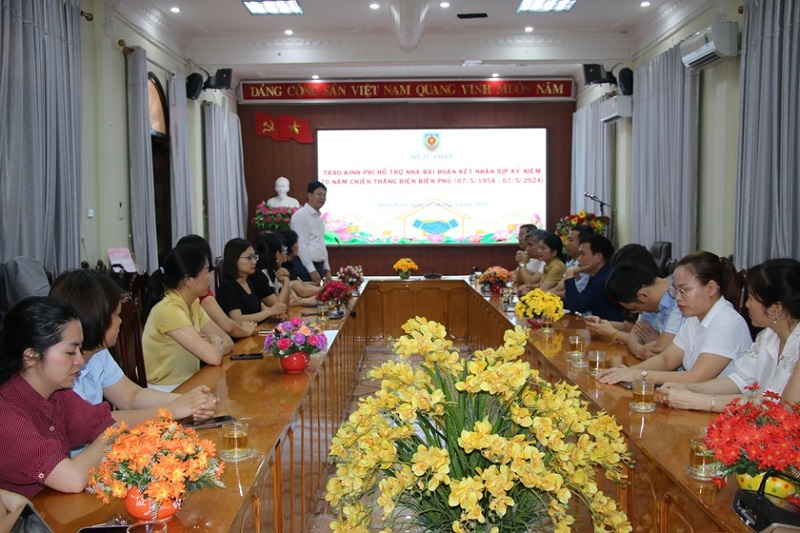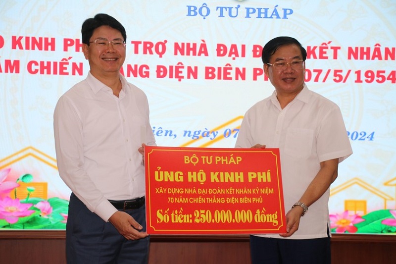 Nhân dịp kỷ niệm 70 năm chiến thắng lịch sử Điện Biên Phủ (07/5/1954-07/5/2024), chiều ngày 07/5/2024, tại trụ sở Sở Tư pháp tỉnh Điện Biên, đ/c Nguyễn Thanh Tịnh - Thứ trưởng Bộ Tư pháp; đồng chí Khương Thị Thanh Huyền - Chủ tịch Công đoàn Bộ Tư pháp cùng với đại diện Lãnh đạo Uỷ ban nhân dân tỉnh, Uỷ ban Mặt trận Tổ quốc Việt Nam tỉnh, Sở Tư pháp và Cục Thi hành án dân sự tỉnh đã tổ chức trao tặng kinh phí hỗ trợ 05 ngôi nhà đại đoàn kết với tổng trị giá 250 triệu đồng cho tỉnh Điện Biên.