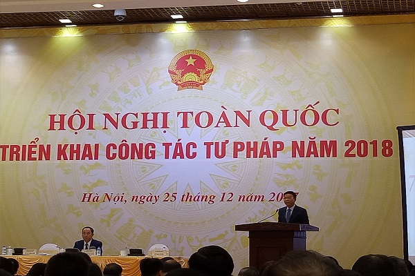 Phát biểu đáp từ sự ghi nhận, biểu dương và chỉ đạo của Chủ tịch Nước Trần Đại Quang, đồng chí Lê Thành Long, Ủy viên Trung ương Đảng, Bí thư Ban Cán sự, Bộ trưởng Bộ Tư pháp thay mặt cho các bộ, công chức, viên chức, người lao động trong ngành Tư pháp và Hệ thống Thi hành án dân sự xin nghiêm túc tiếp thu những ý kiến chỉ đạo của đồng chí Chủ tịch Nước để triển khai có hiệu quả công tác tư pháp và công tác thi hành án dân sự trong năm 2018 cũng như những năm tiếp theo, phấn đấu làm cho hoạt động tư pháp ngày càng đáp ứng tốt hơn yêu cầu phát triển của đất nước trong giai đoạn mới. Trong quá trình thực hiện nhiệm vụ của mình, Ngành Tư pháp mong tiếp tục nhận được sự quan tâm lãnh đạo, chỉ đạo của đồng chí Chủ tịch Nước; mong các cấp, các ngành tiếp tục phối hợp chặt chẽ hơn nữa và hiệu quả hơn nữa với Bộ và Ngành Tư pháp, cũng như Hệ thống Thi hành án dân sự để tiếp tục nâng cao hiệu lực, hiệu quả của công tư tư pháp, công tác thi hành án dân sự.