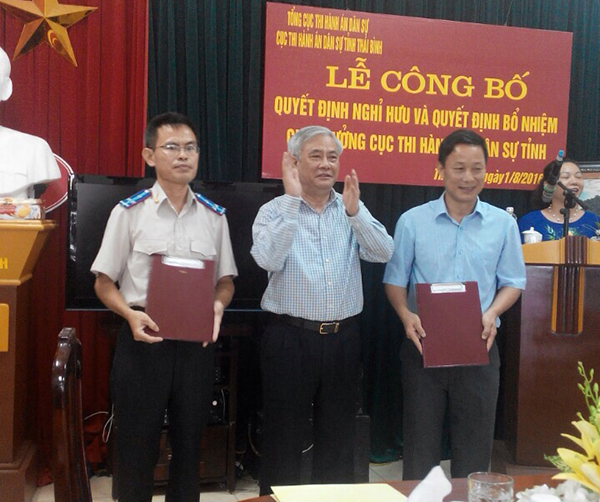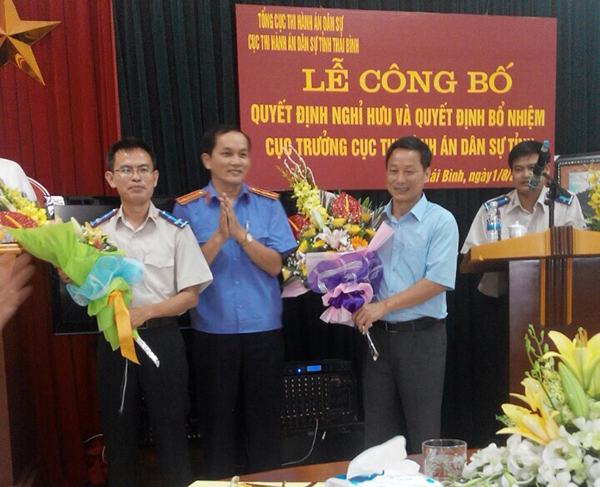 Chiều ngày 01 tháng 8 năm 2016, tại Cục Thi hành án dân sự tỉnh Thái Bình, Tổng cục Thi hành án dân sự (Bộ Tư pháp) công bố Quyết định bổ nhiệm Cục trưởng Cục Thi hành án dân sự tỉnh Thái Bình đối với đồng chí Lê Xuân Hồng và trao Quyết định nghỉ chế độ đối với đồng chí Nguyễn Ngọc Tăng. Tham dự buổi lễ, về phía Bộ Tư pháp có đồng chí Hoàng Sỹ Thành - Tổng Cục trưởng Tổng cục Thi hành án dân sự, đồng chí Trần Thị Phương Hoa - Vụ trưởng Vụ Tổ chức cán bộ Tổng cục Thi hành án dân sự; về phía tỉnh Thái Bình có đồng chí Phạm Văn Xuyên - Phó Chủ tịch UBND tỉnh, Trưởng Ban Chỉ đạo Thi hành án dân sự tỉnh, cùng đại diện lãnh đạo một số sở, ban, ngành của tỉnh; Lãnh đạo Cục, Chi cục trưởng Chi cục Thi hành án dân sự huyện, thành, thị và toàn thể cán bộ, công chức đang công tác tại Cục Thi hành án dân sự tỉnh Thái Bình.