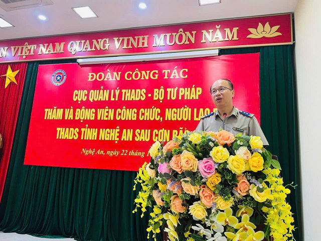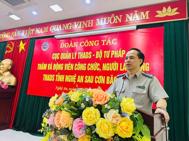 đồng chí Trần Hồng Quang, Chánh Văn phòng đã ghi nhận tinh thần chủ động, kịp thời trong việc nắm bắt thông tin và quán triệt, chỉ đạo triển khai công tác phòng chống bão, lũ của tập thể lãnh đạo THADS tỉnh Nghệ An đến toàn thể các đơn vị và công chức, người lao động trực thuộc. Tuy nhiên, do cơn bão số 10 được đánh giá là cơn bão mạnh, ảnh hưởng trực tiếp đến tỉnh Nghệ An trong đó có một số trụ sở đơn vị và gia đình công chức, người lao động cơ quan THADS tỉnh Nghệ An đã có những thiệt hại đáng kể. Thay mặt Cục Quản lý THADS và toàn hệ thống THADS, đoàn công tác đã chia sẻ và trao số tiền 100.000.000 đồng là tấm lòng của công chức, người lao động toàn hệ thống THADS chung tay để động viên đơn vị, công chức, người lao động THADS tỉnh Nghệ An bị thiệt hại khắc phục một phần hậu quả trong đợt bão, lũ vừa qua. Mong đơn vị và các đồng chí trong cơ quan THADS tỉnh Nghệ An tiếp tục cố gắng phấn đấu hoàn thành tốt các nhiệm vụ được Cục Quản lý THADS – Bộ Tư pháp giao trong năm 2026.