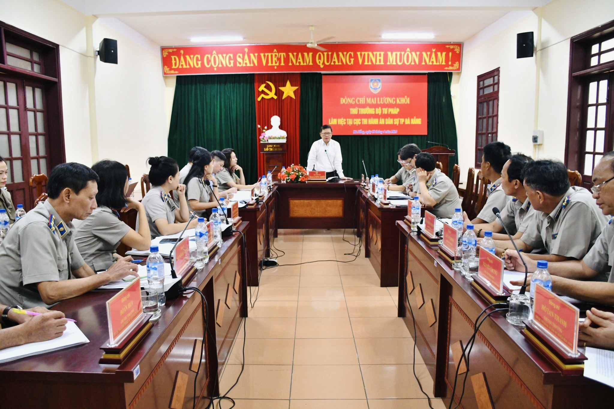 Phát biểu tại buổi làm việc, Thứ trưởng Mai Lương Khôi ghi nhận kết quả công tác THADS trên địa bàn thành phố Đà Nẵng đã có khởi sắc, tiến bộ, kết quả về việc cao hơn cùng kỳ năm 2023; công tác chỉ đạo, điều hành bước đầu đã được đổi mới theo hướng sâu sát, chặt chẽ, phối hợp đồng bộ, nghiêm túc theo đúng quy chế, quy trình của Bộ, ngành và chỉ đạo của cấp trên. Đồng thời, chia sẻ những khó khăn về biên chế, cơ sở vật chất và đặc biệt là những khó khăn, phức tạp trong quá trình tổ chức thi hành các bản án hình sự về tham nhũng, kinh tế.